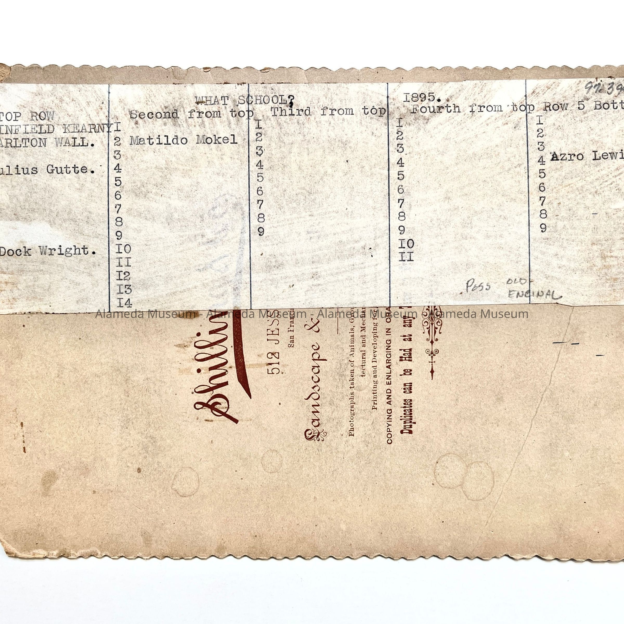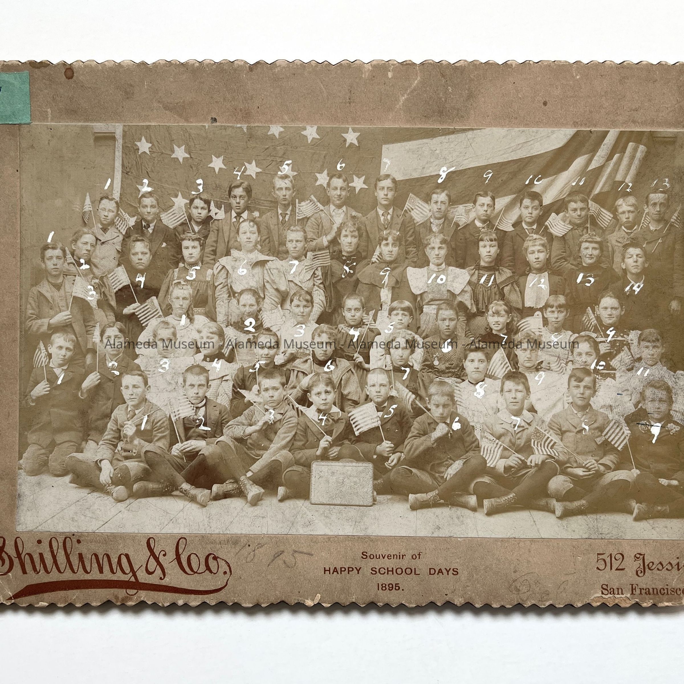 History of Object: Class picture taken in front of a large U.S. flag backdrop. The school is unidentified, but it possibly is the old Encinal (later Mastick) School. A few students are identified on the verso.