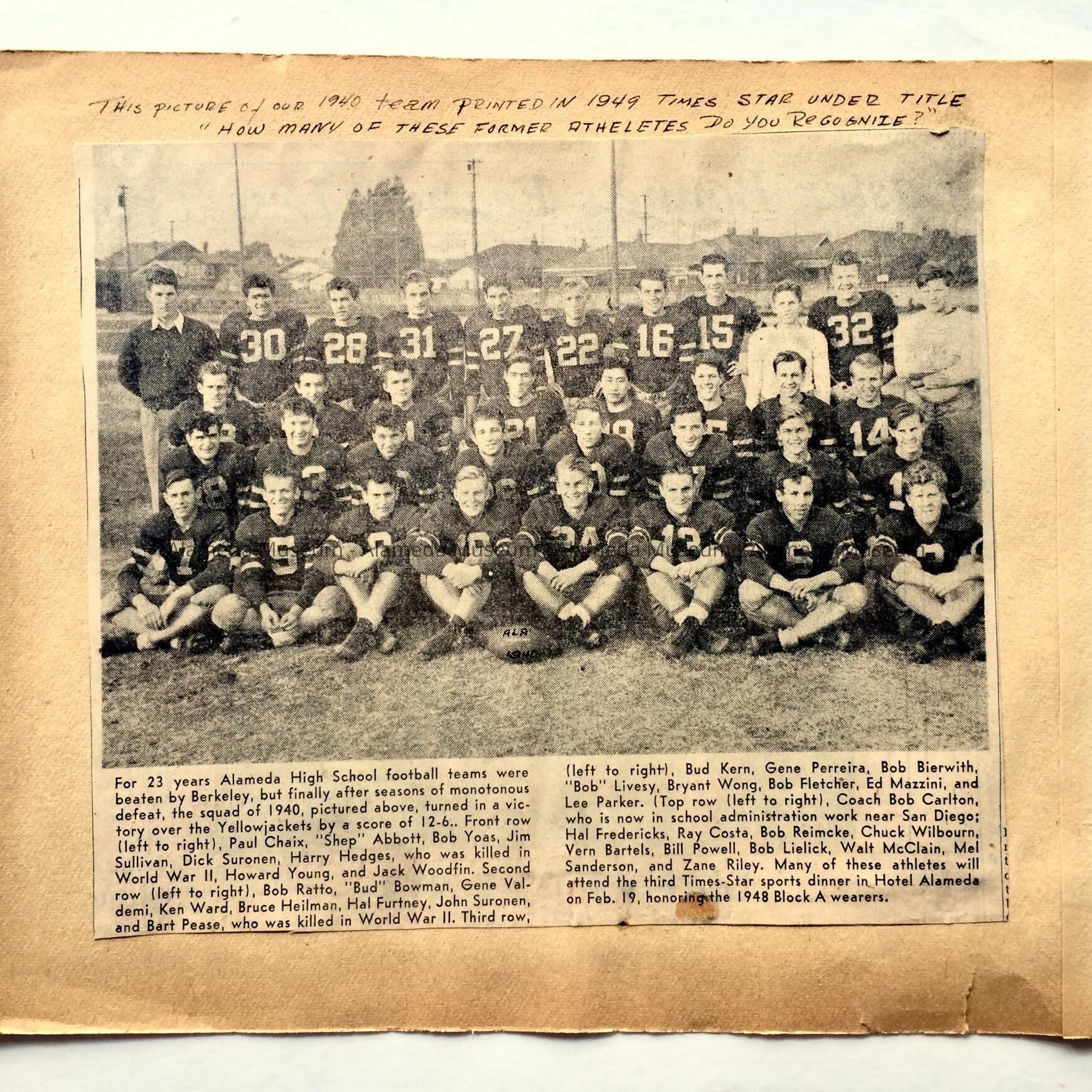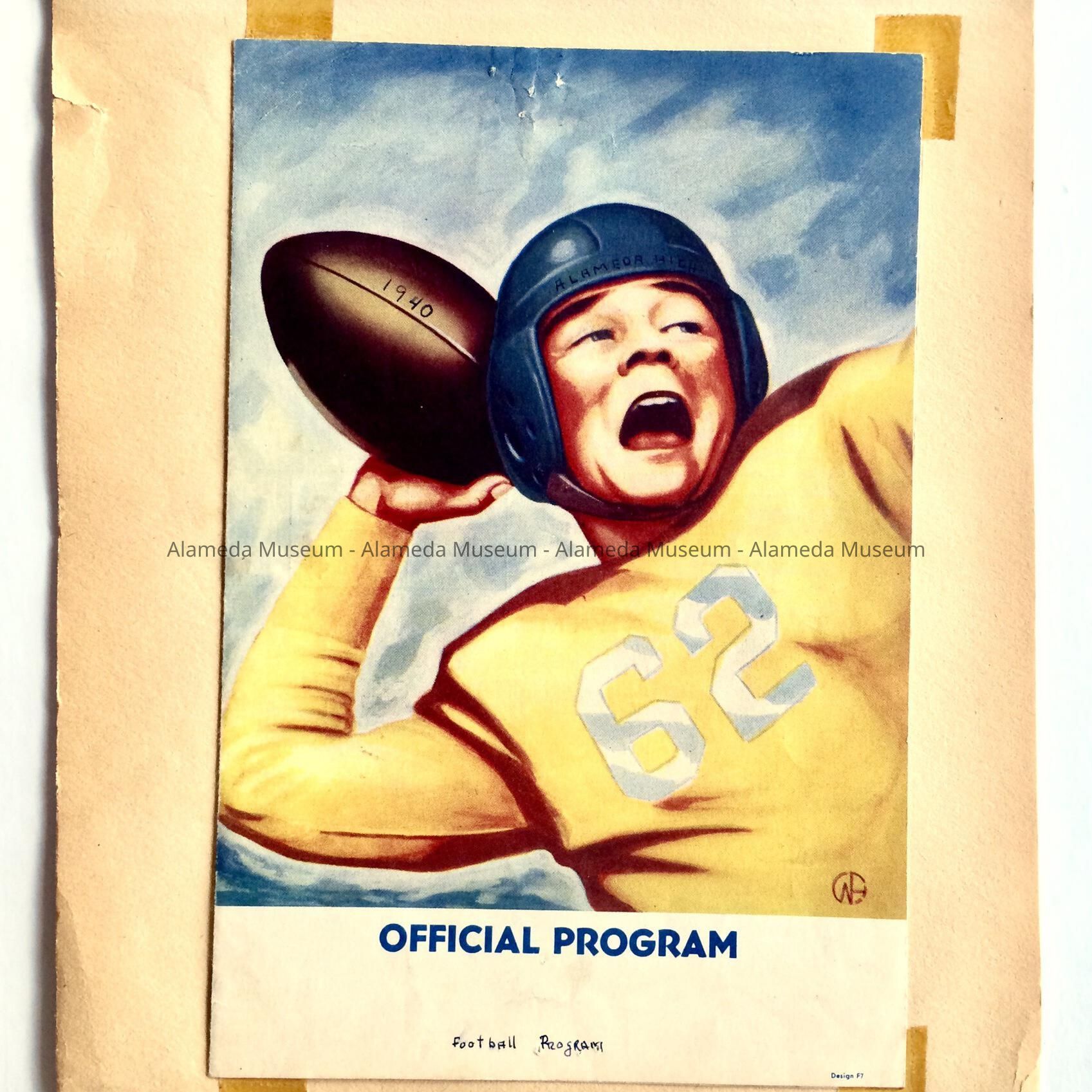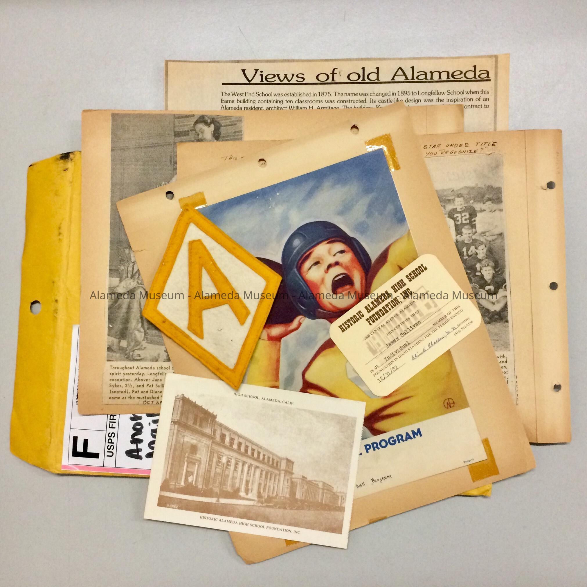 Description: Collection of school-related memorabilia: 3 scrapbook pages with clippings, dating c 1948, and one side with a high 1940 school football program of a game against Hayward (A-C) in original envelope; a felt diamond-shaped yellow-and-white Alameda high School patch (D); a clipping of a photo of West End (later Longfellow) School (E); a 1982 membership card of the Alameda High School Foundation for James Sullivan (F), and postcard from same with reproduced image of the high school (G).