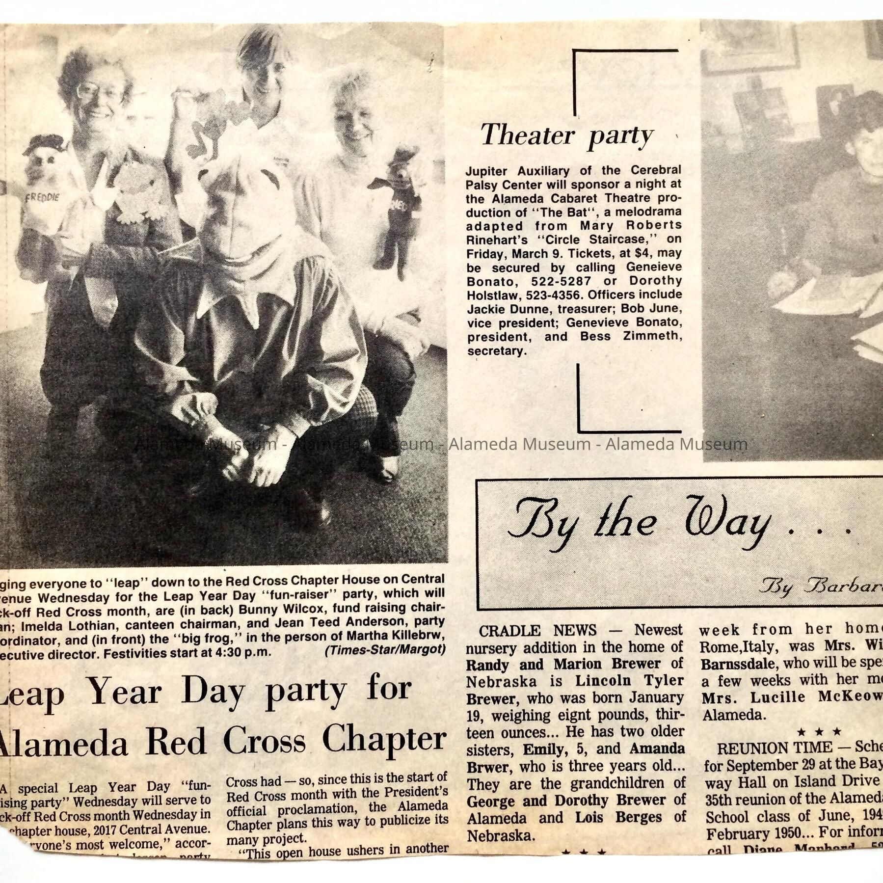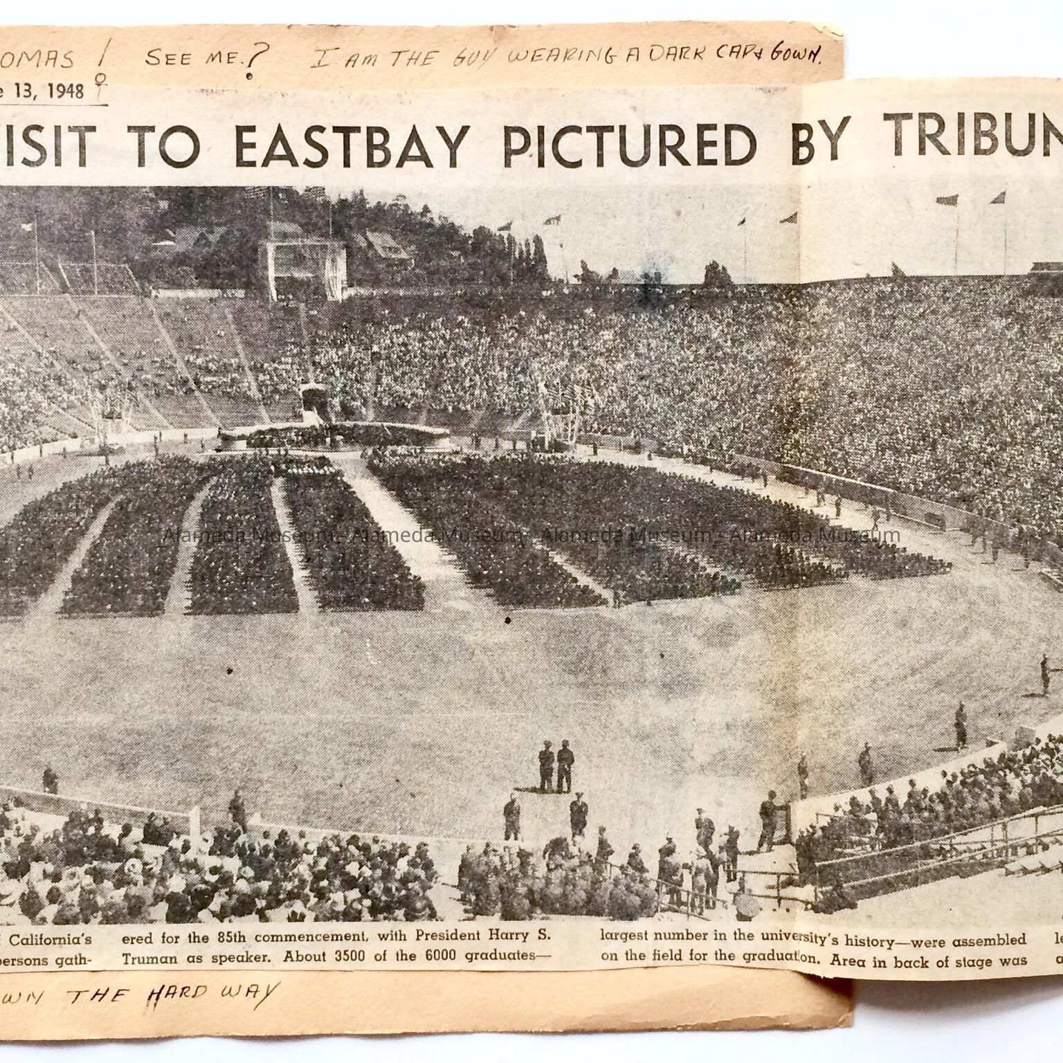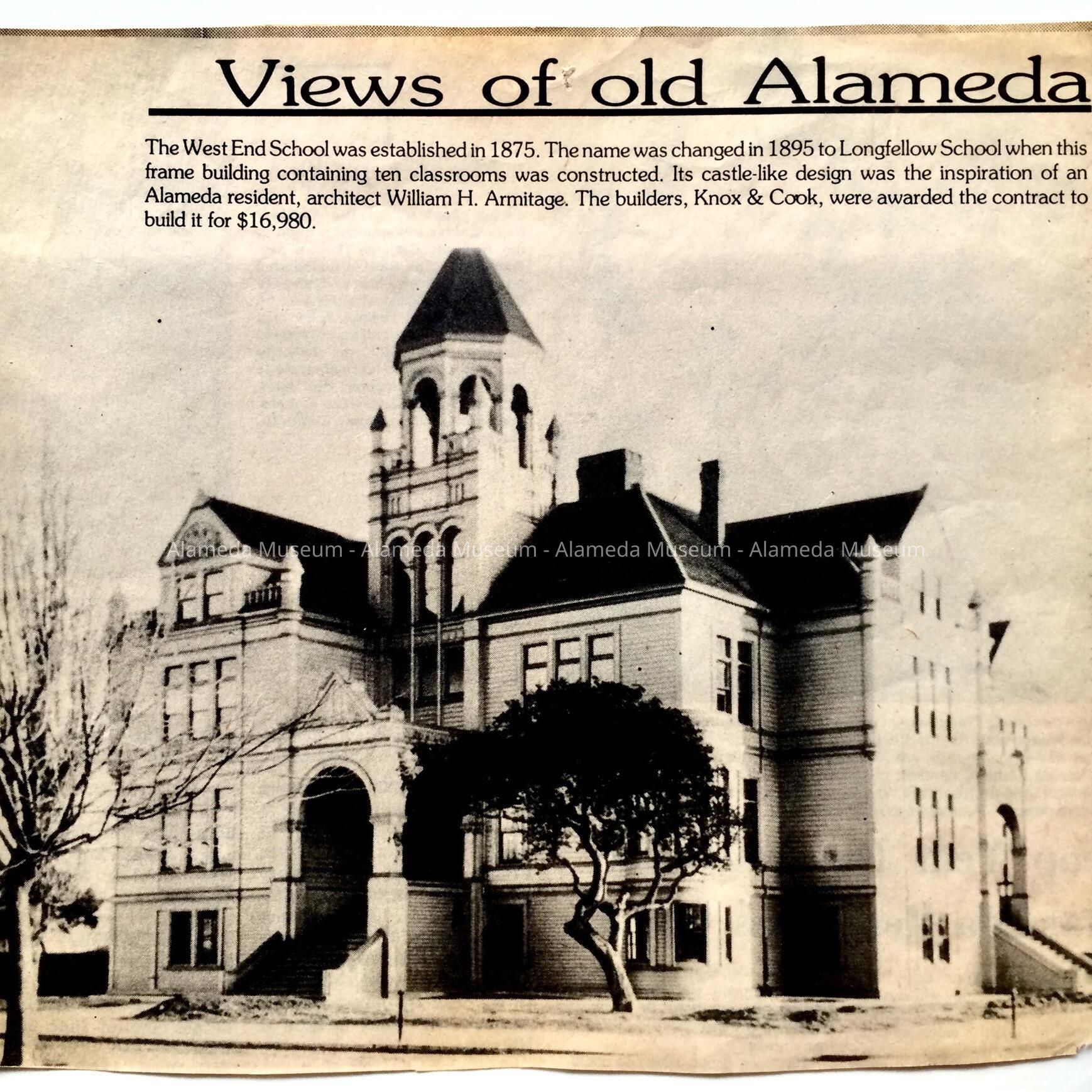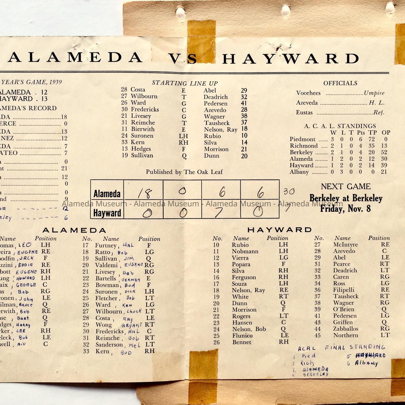Description: Collection of school-related memorabilia: 3 scrapbook pages with clippings, dating c 1948, and one side with a high 1940 school football program of a game against Hayward (A-C) in original envelope; a felt diamond-shaped yellow-and-white Alameda high School patch (D); a clipping of a photo of West End (later Longfellow) School (E); a 1982 membership card of the Alameda High School Foundation for James Sullivan (F), and postcard from same with reproduced image of the high school (G).