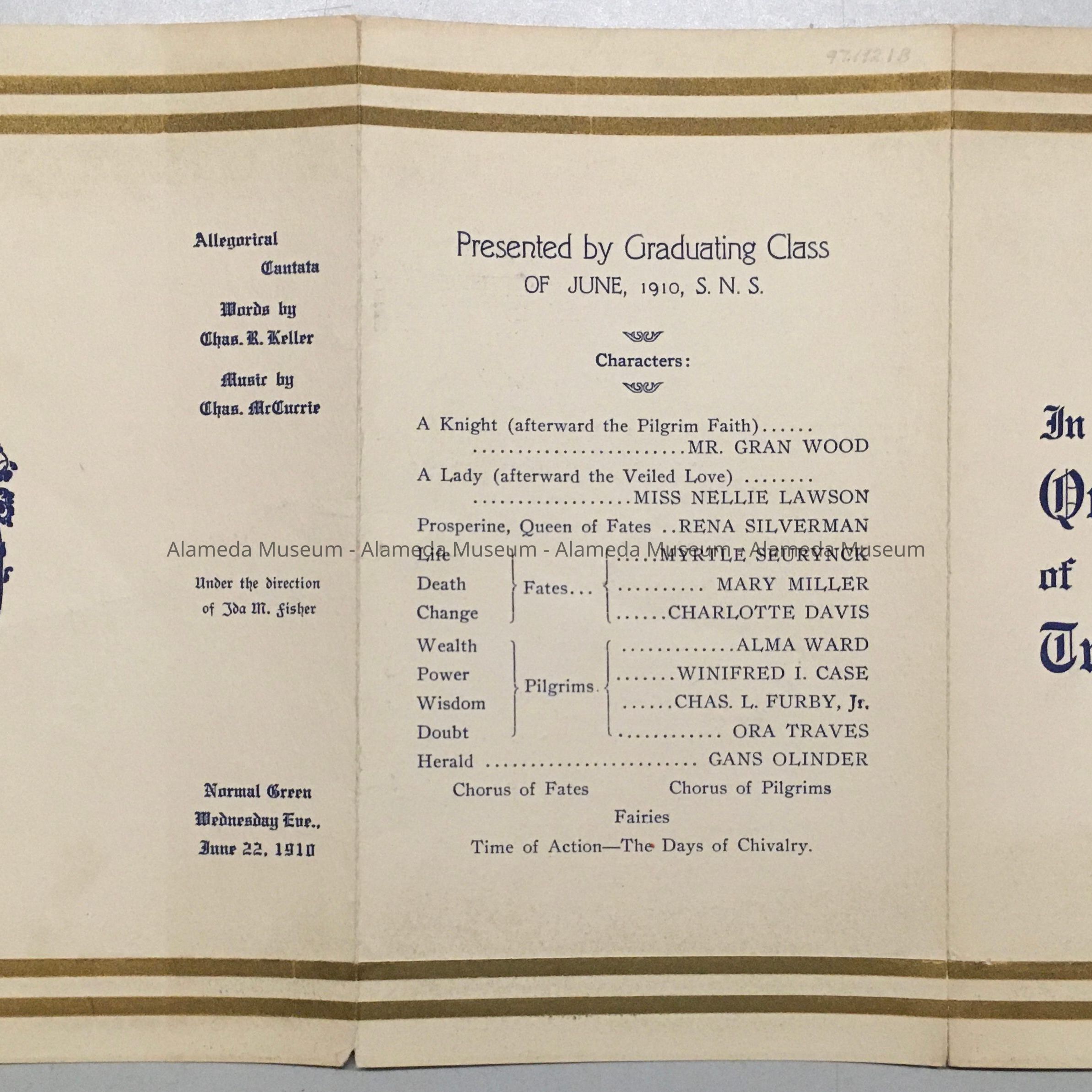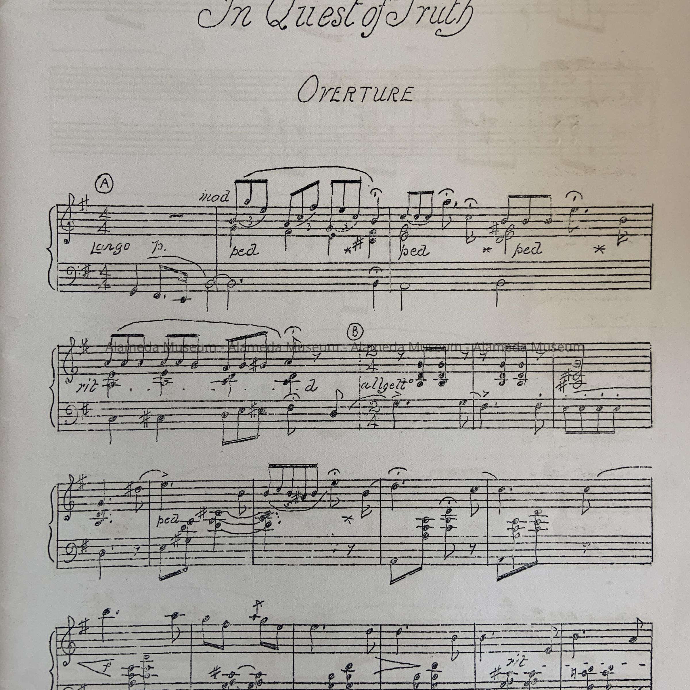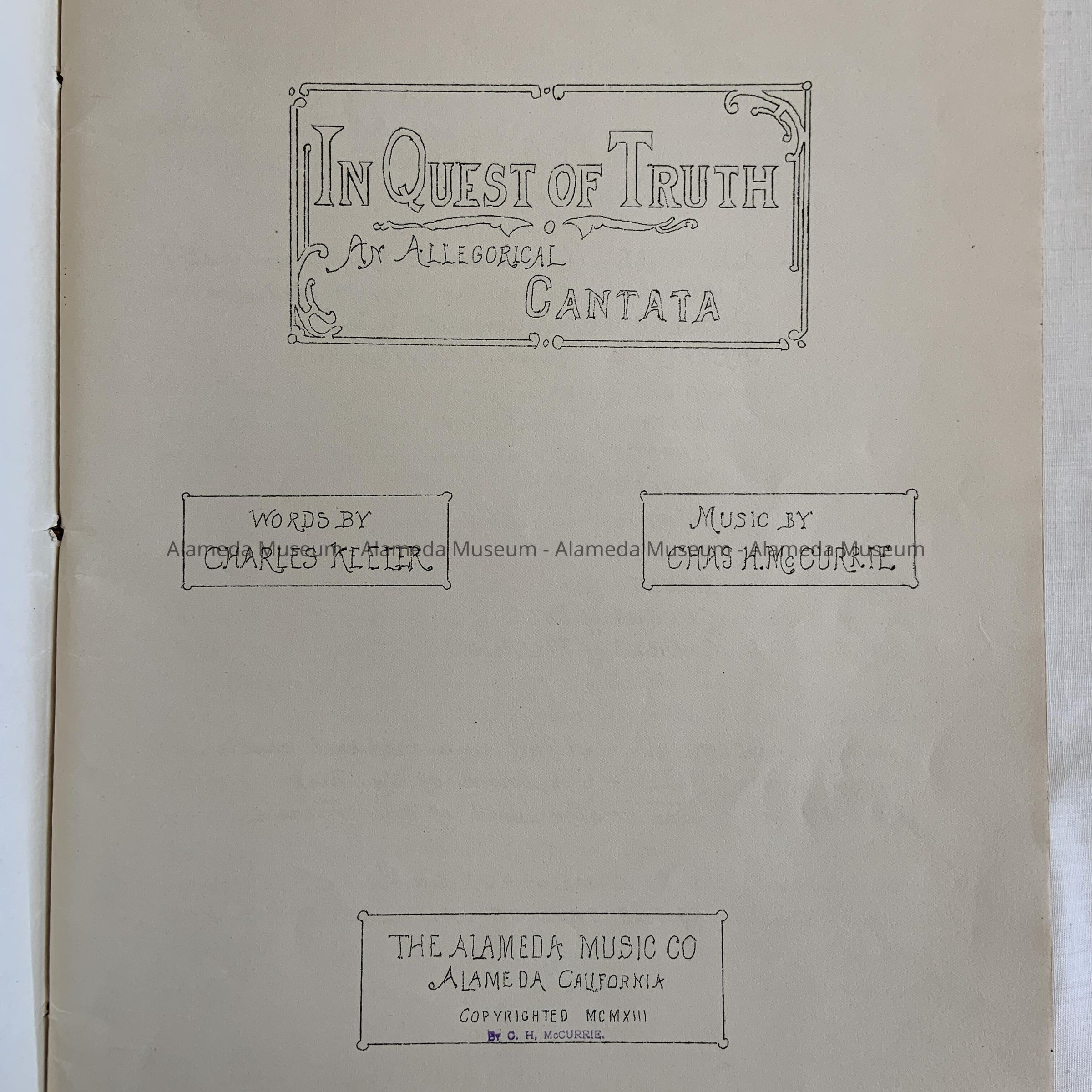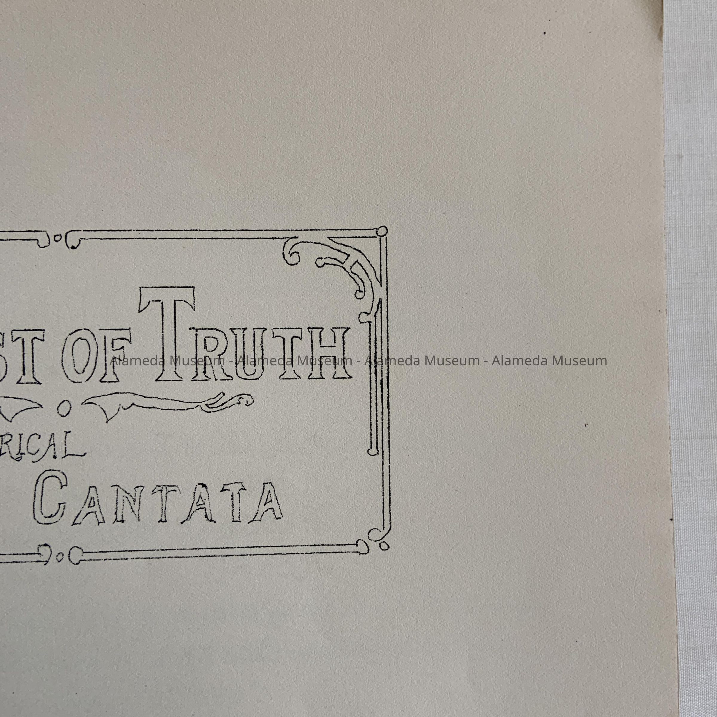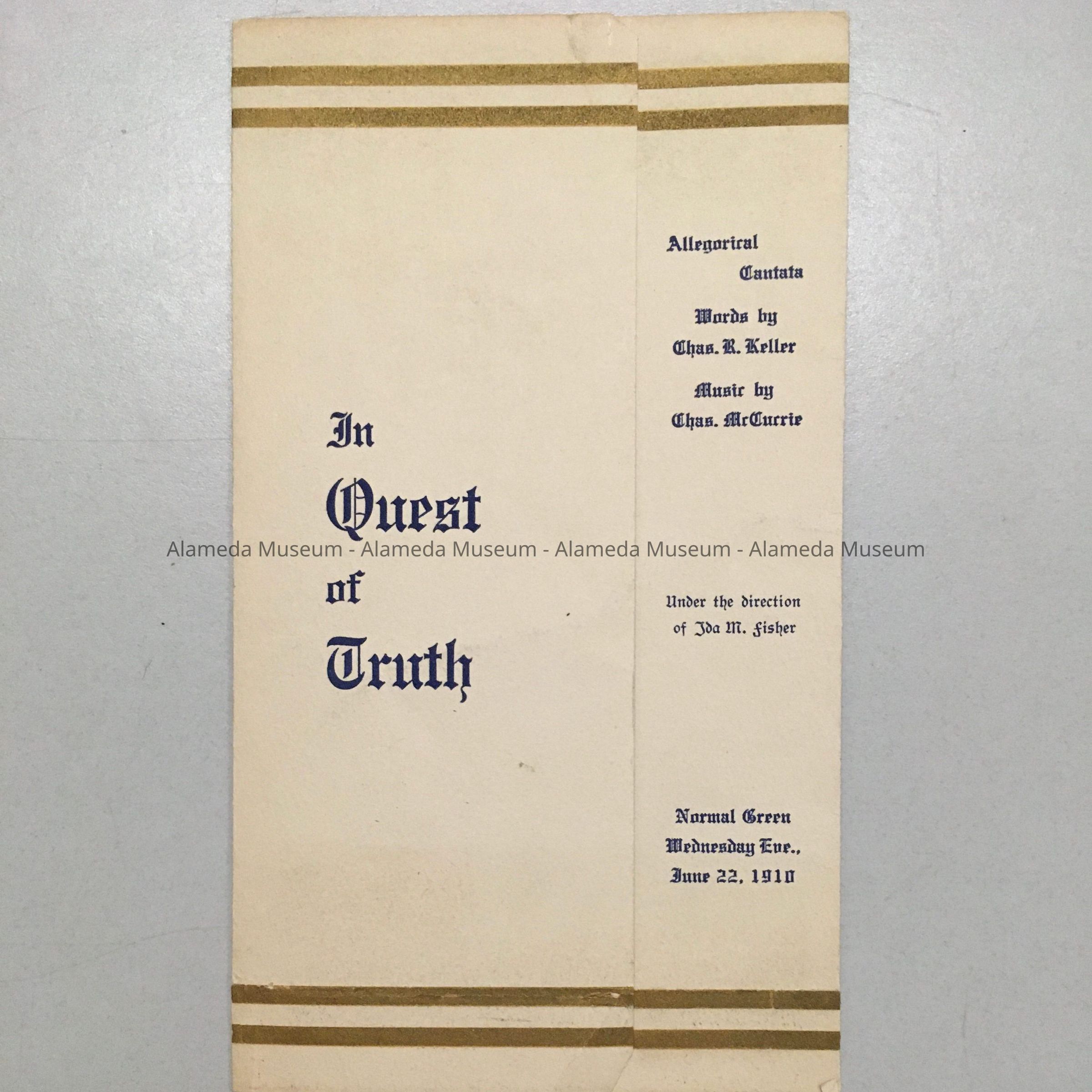 MUSIC SCORE FOR THE CANTATA, "IN QUEST OF TRUTH." MUSIC BY CHARLES M McCURRIE; WORDS BY CHARLES KEELER. PUBLISHED BY THE ALAMEDA MUSIC COMPANY, ALAMEDA, CALIFORNIA. PROGRAM FOR THE FIRST PRESENTATION IN SAN JOSE, CALIFORNIA.