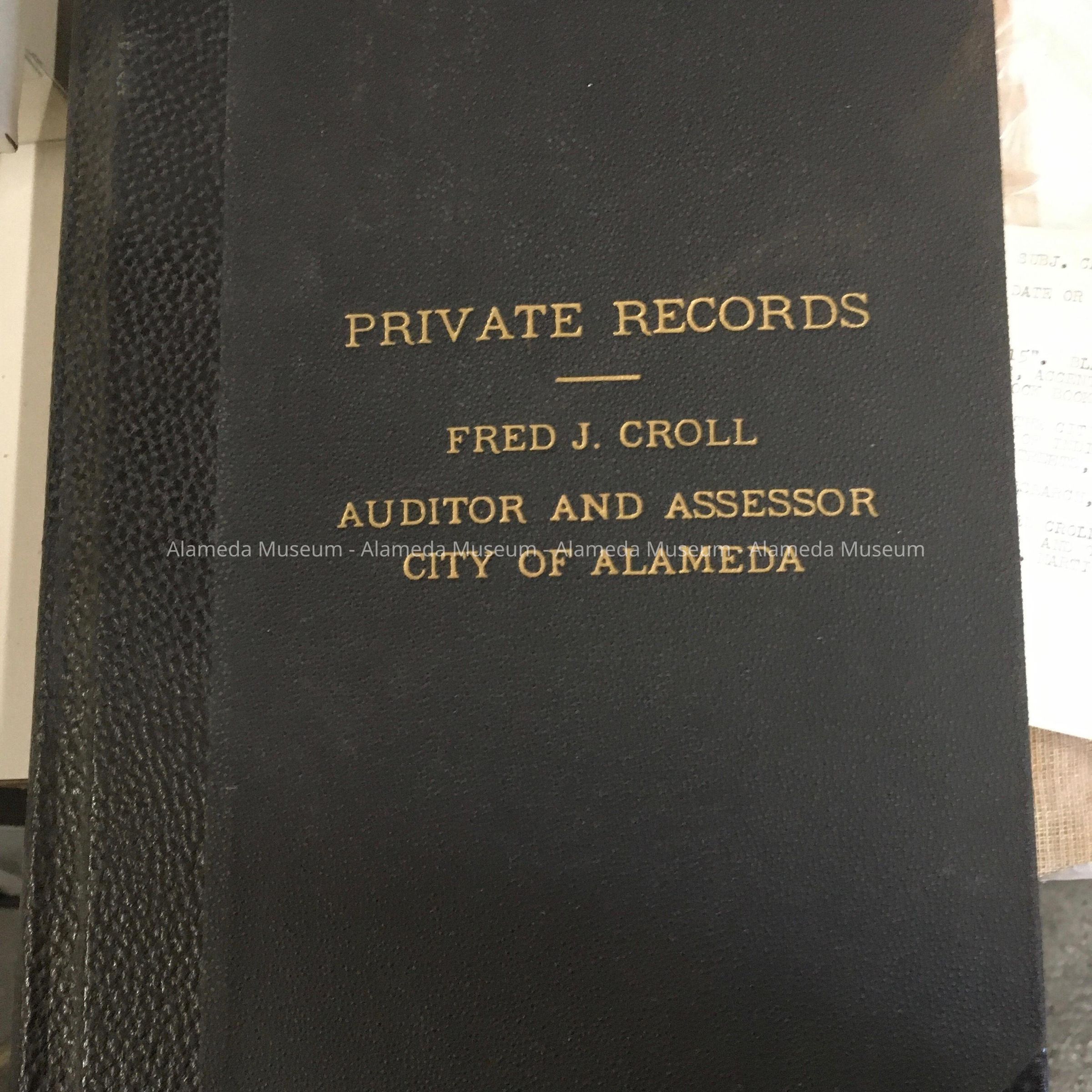 ENGRAVED IN GOLD "PRIVATE RECORDS FRED J. CROLL, AUDITOR AND ASSESSOR, CITY OF ALAMEDA.
