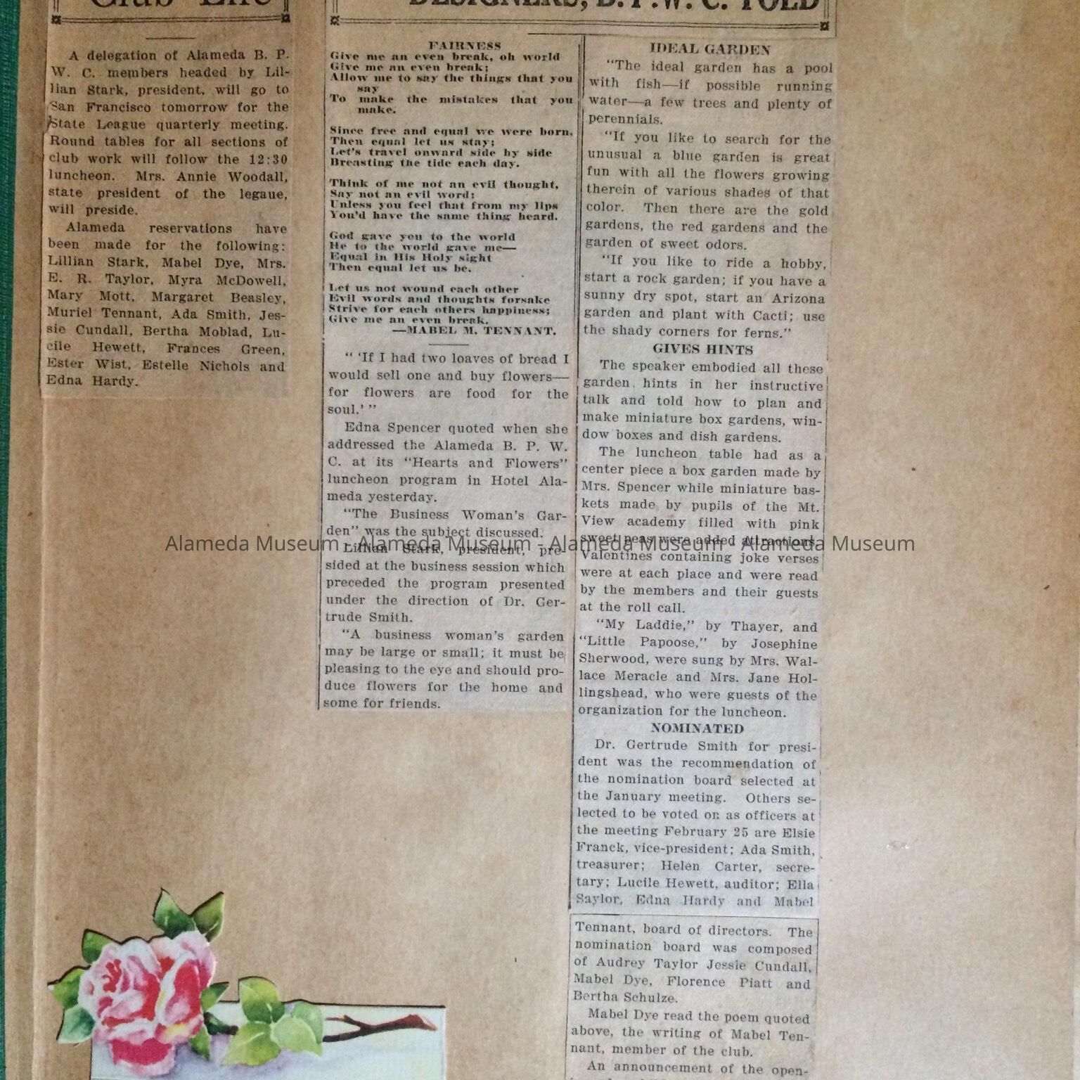 Archives from the Alameda Branch of the BPWC. Formerly the property of Mabel Tennant and as a result of board action it was decided to donate to the museum.