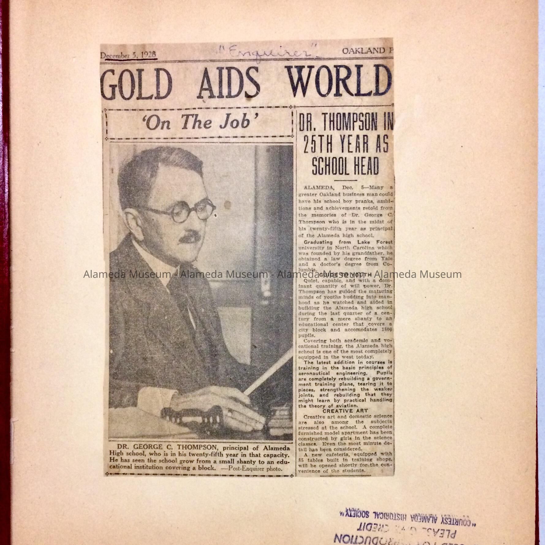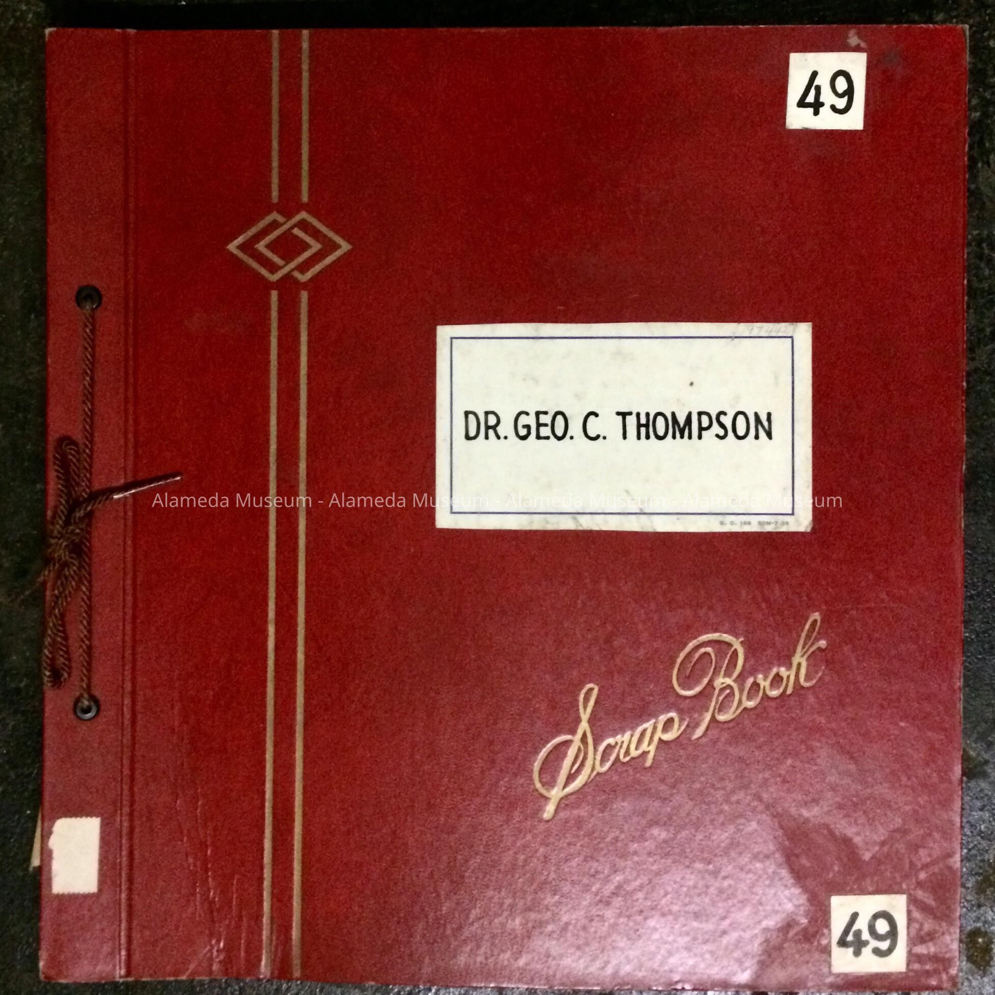 CONTEMPORARY LOOSE-LEAF SCRAP BOOK IN WHICH HAVE BEEN COMPILED NEWSPAPER CLIPPINGS, CERTIFICATES, ETC., ON THE LIFE AND CAREER OF DR GEORGE C THOMPSON, LONGTIME PRINCIPAL OF ALAMEDA HIGH SCHOOL. ALBUM, NUMBERED "49," WAS POSSIBLY CREATED BY A FORMER MEMBER OF THE ALAMEDA HISTORICAL MUSEUM PRIOR TO 1971.
