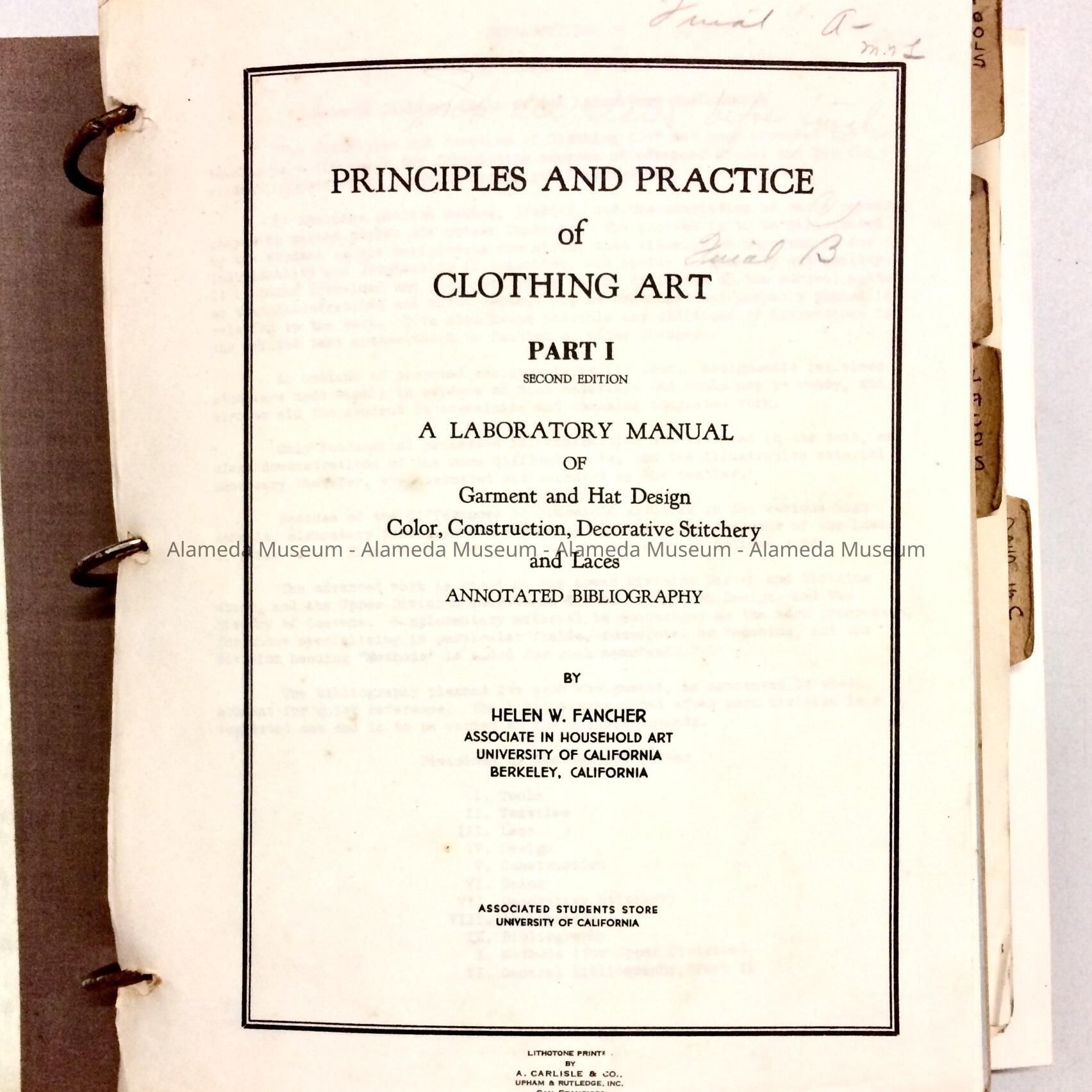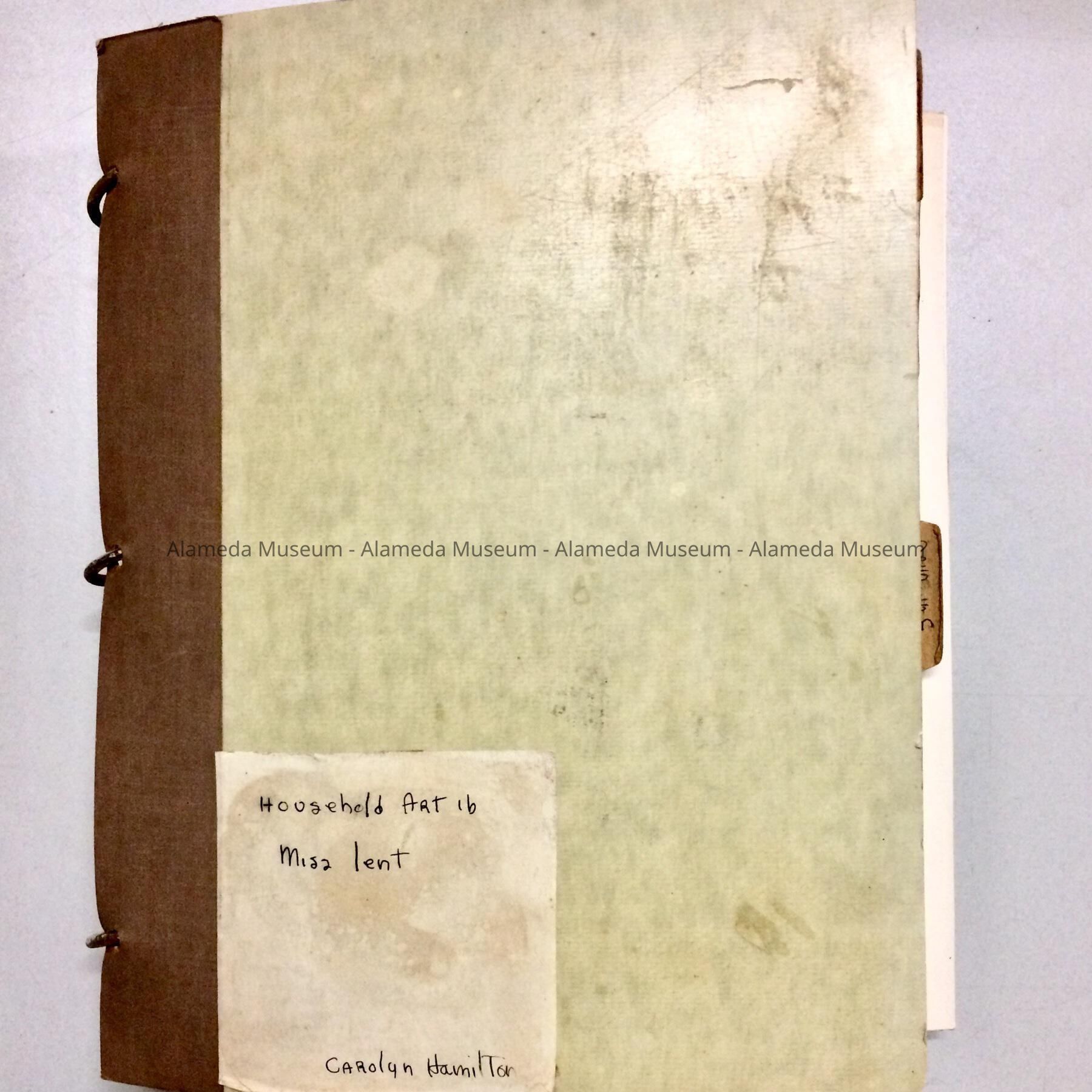 Description: A soft bound scrapbook illustrated with drawings, dress patterns, etc, metal rings are part of the bindings. The cover has a paper label with handwritten captions, "Household Art 16" and "Carolyn Hamilton".
