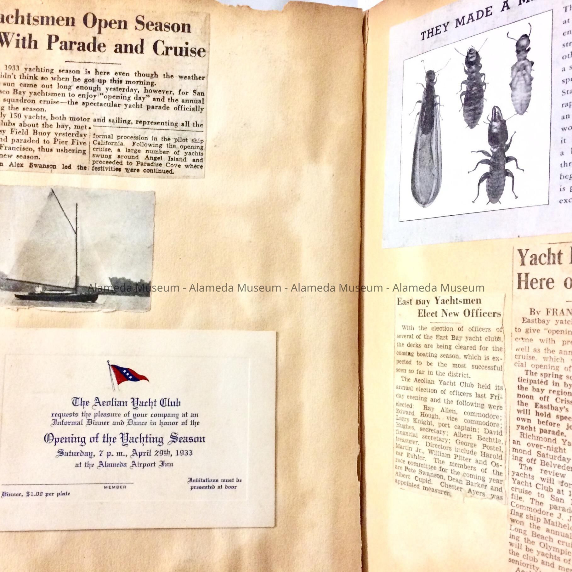 SCRAPBOOK, WITH COMPILED NEWSPAPER CLIPPINGS, LETTERS, AND PHOTOGRAPHS CONCERNING THE ACTIVITIES OF THE AEOLIAN YACHT CLUB, FOUNDED IN 1906, LOCATED ON FERNSIDE BLVD NEAR THE BAY FARM ISLAND BRIDGE IN ALAMEDA.