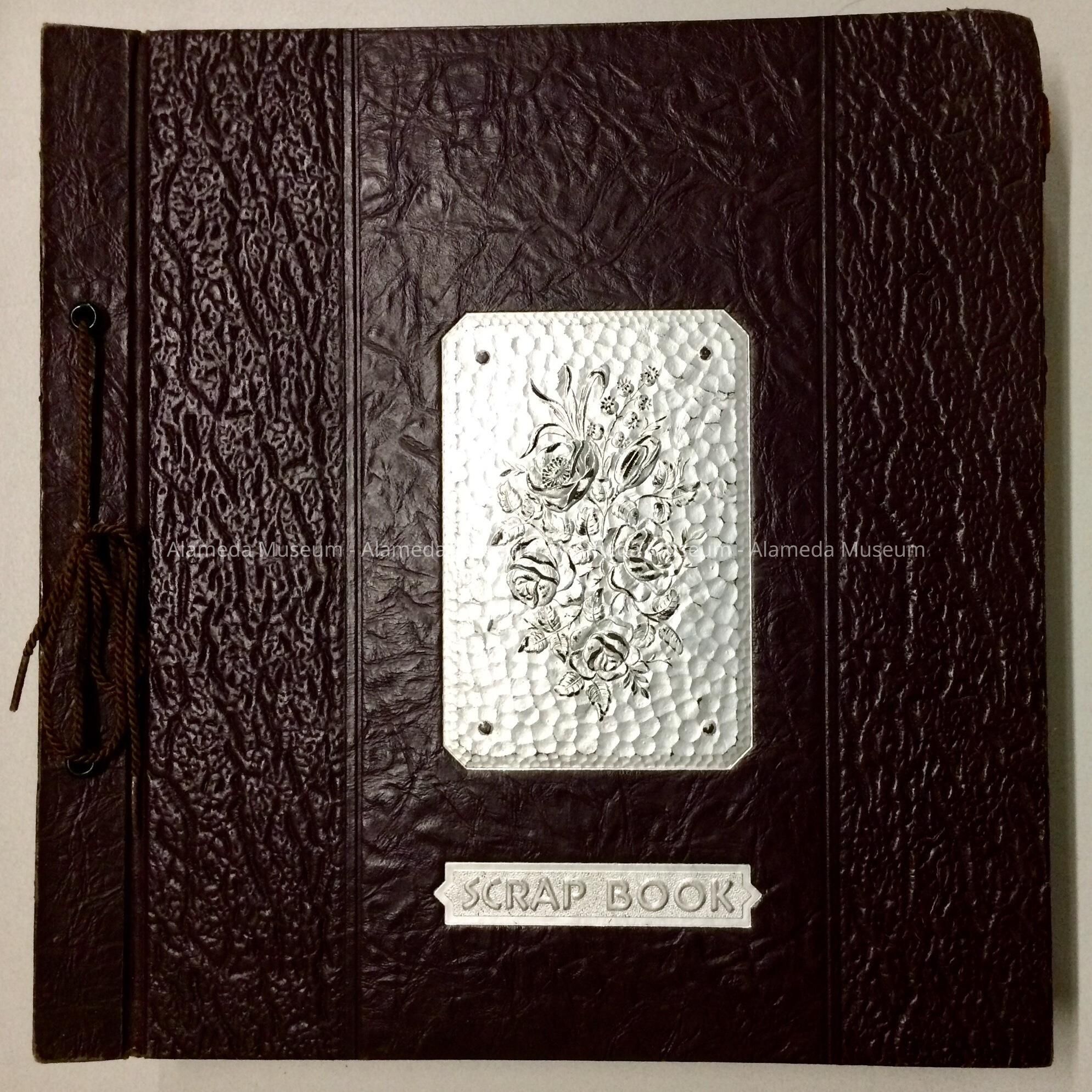 Description: Loose leaf scrapbook with a cover of embossed pseudo-leather paper. The cover design also features embossed flowers and a caption, “Scrapbook" on a burgundy colored background.