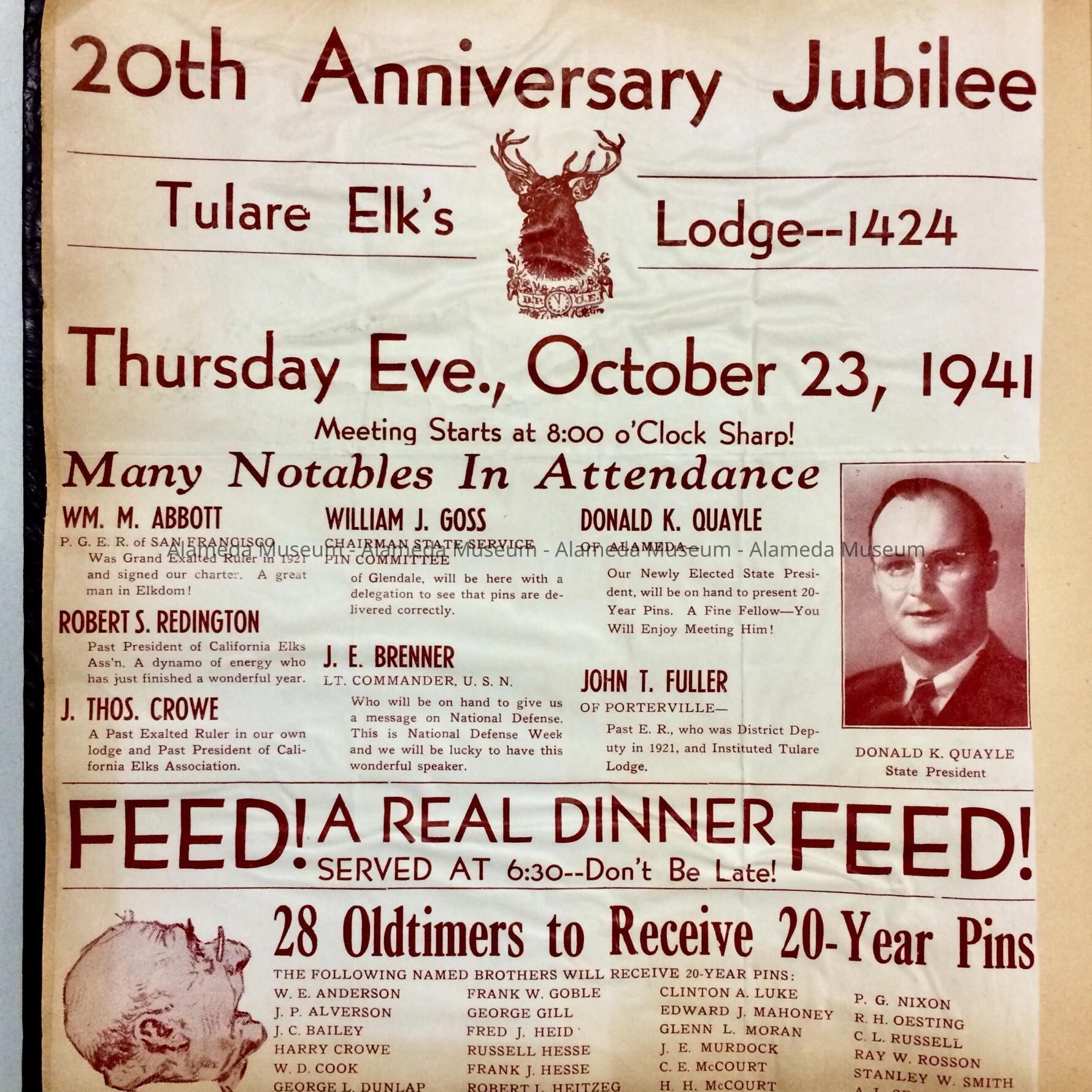History of Object: Scrapbook of illustrated newspaper clippings and photographs pertaining to the Alameda Elks Lodge of which the donor's father, Donald K. Quayle was a prominent member. Mr. Quayle was an attorney who was appointed judge of the Alameda Municipal Court in 1948.