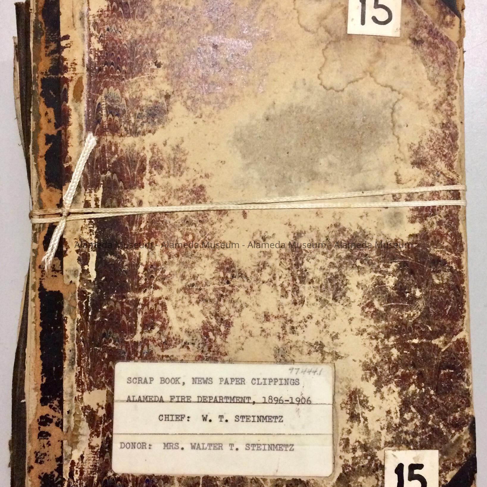 SCRAPBOOK OF PAPER CLIPPINGS CONCERNING ACTIVITIES OF THE ALAMEDA FIRE DEPARTMENT, FROM 1896 THROUGH 1906. INCLUDED ARE NEWSPAPER ARTICLES CONCERNING THE BURNING OF THE LINDERMAN OPERA HOUSE ON CENTRAL AND PARK AVENUES, AND THE COHEN MANSION (FERNSIDE), BOTH DESTROYED BY FIRE IN 1897. INCLUDED ARE MANY CLÍPPINGS CONCERNING FIRES IN THE COMMUNITY. SCRAPBOOK COVERS THE PERIOD OF VOLUNTEER FIRE COMPANIES TO THE ESTABLISHMENT OF PAID FIREMEN. BOOK ORIGINALLY GIVEN TO THE ALAMEDA HISTORICAL SOCIETY PRIOR TO 1971, NUMBERED "15," AND NEVER OFFICIALLY CATALOGED.