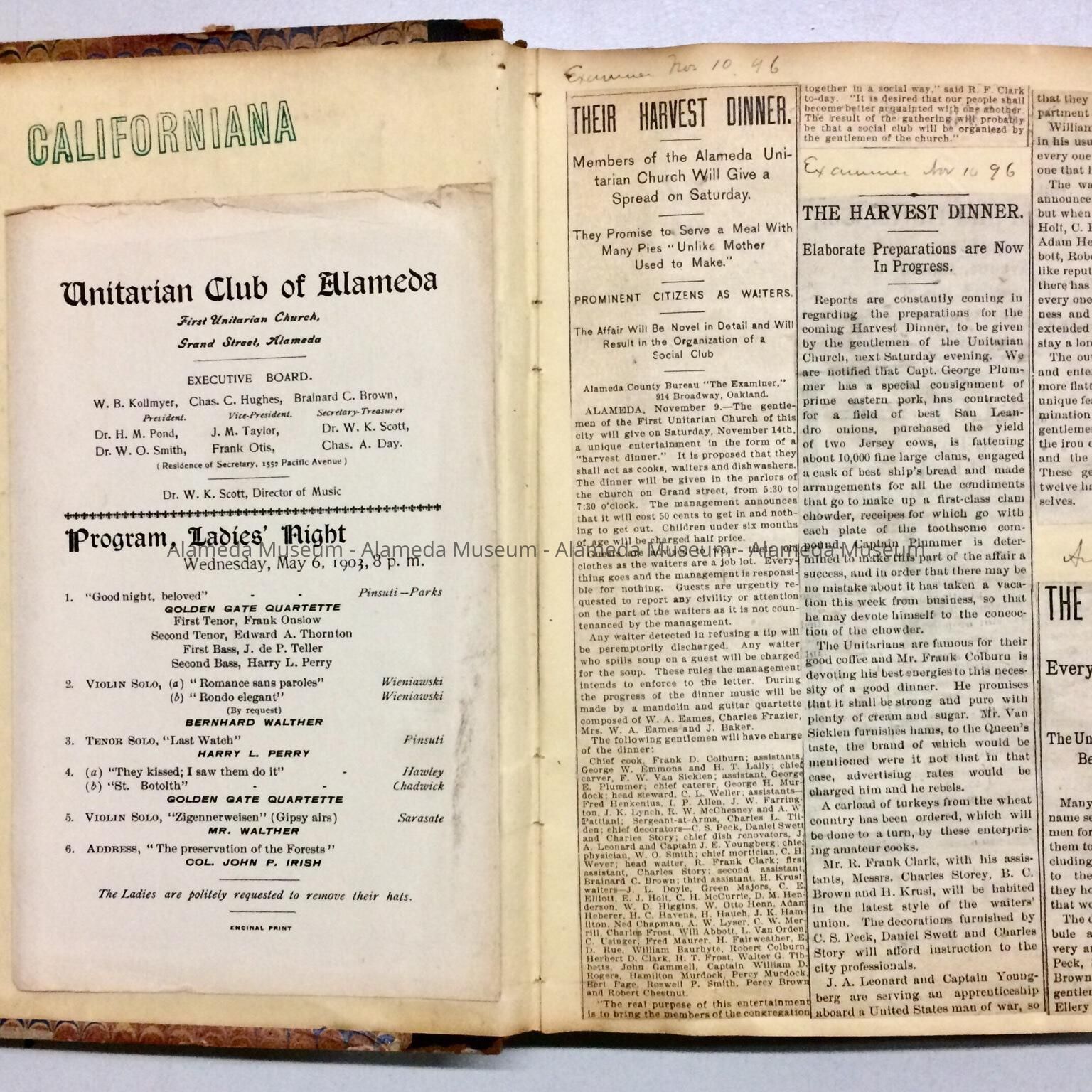 SCRAPBOOK CONTAINING NEWSPAPER CLIPPINGS, PROGRAMS, ETC., OF THE UNITARIAN CLUB OF ALAMEDA. CLIPPINGS HAVE HANDWRITTEN CAPTIONS, STATING NEWSPAPER SOURCES AND DATES. SCRAPBOOK WAS GIVEN TO THE ALAMEDA HISTORICAL SOCIETY PRIOR TO 1971, NUMBERED "167-X," AND HERETOFORE NOT OFFICIALLY CATALOGED.