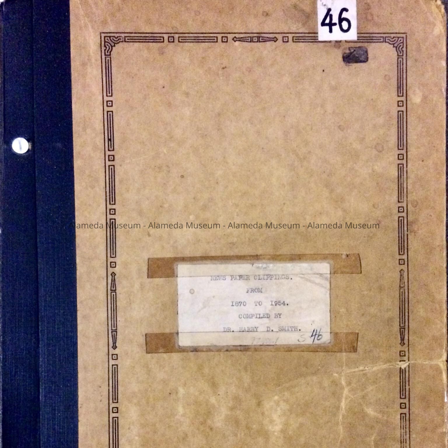 SCRAP BOOK COMPILED BY THE LATE DR HARRY D SMITH, WHO WAS CURATOR OF THE ALAMEDA HISTORICAL SOCIETY. ALBUM CONTAINS DEEDS, MISCELLANEOUS CLIPPINGS, ORIGINAL BROCHURES, ETC., RELEVANT TO VARIOUS ASPECTS OF ALAMEDA HISTORY. NEWSPAPER CLIPPINGS RELATED TO EARLY ALAMEDA HISTORICAL SOCIETY EVENTS, INCLUDING SOME WITH PORTRAITS OF DR SMITH. ALBUM WAS NUMBERED "S-46" AND HERETOFORE NOT OFFICIALLY CATALOGED.