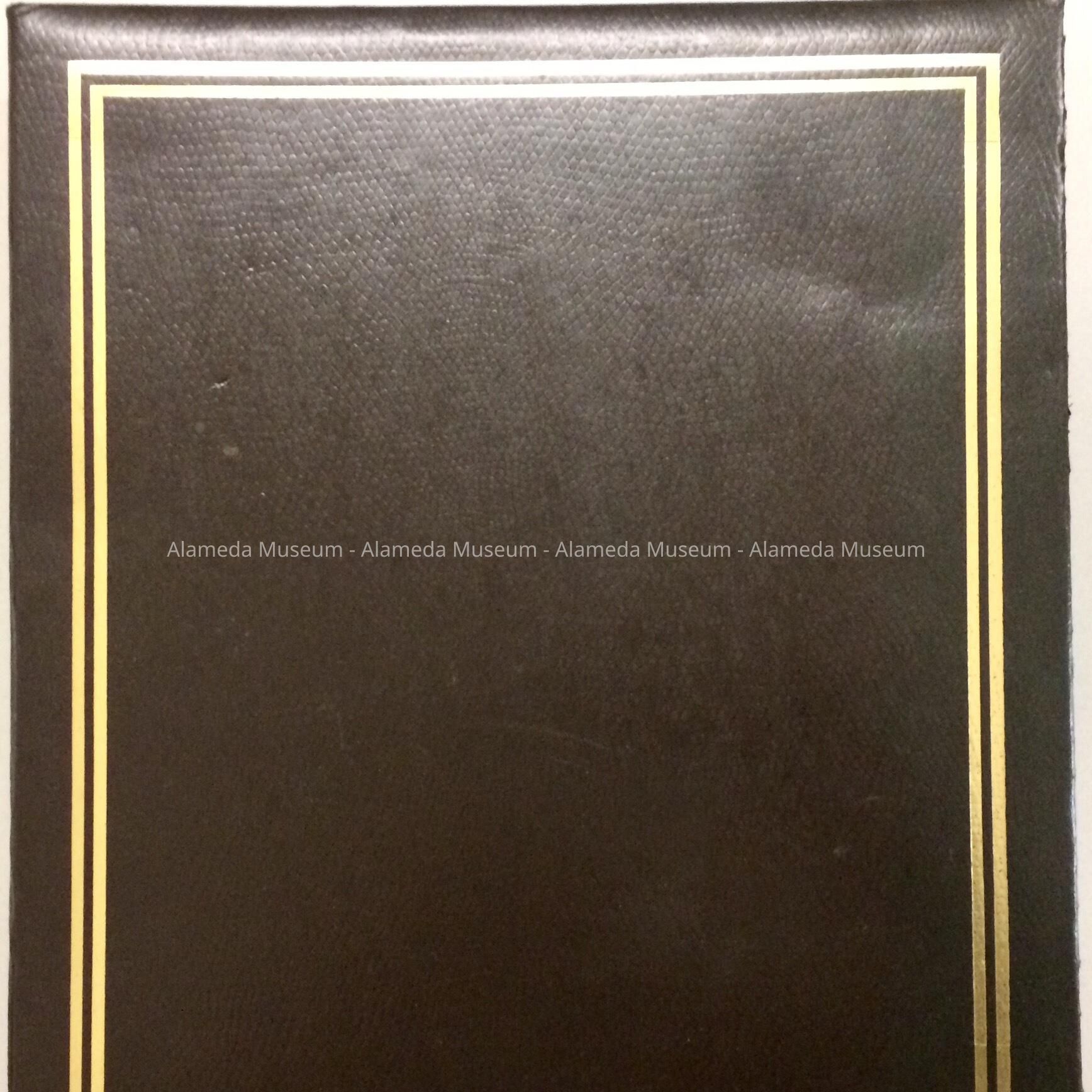A MODERN SCRAPBOOK, HARD-BOUND, WITH COVERS OF BLUE-COLORED IMITATION LEATHER (PLASTIC) AND GOLD-COLORED PINSTRIPING.