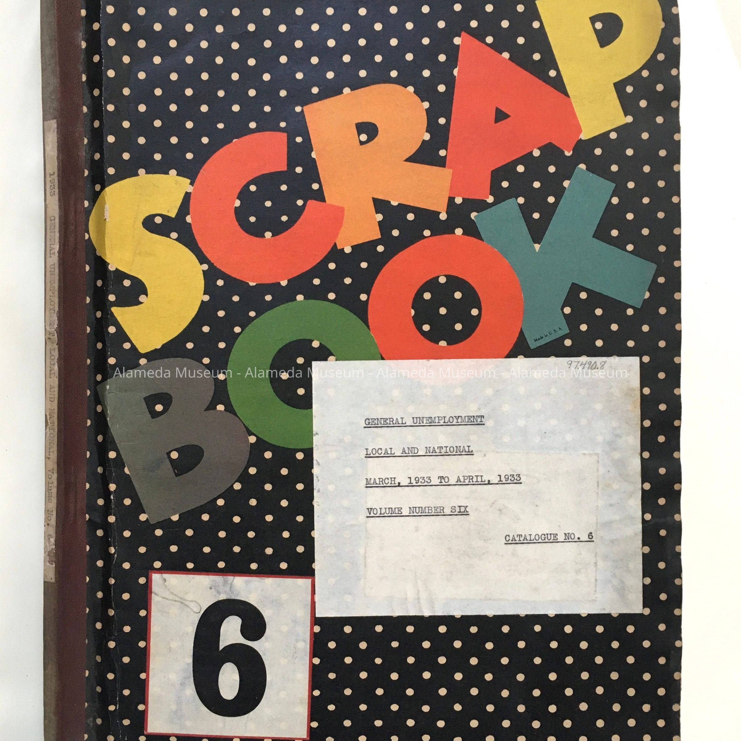 SCRAPBOOK, WITH TYPEWRITTEN PAPER LABEL, "GENERAL UNEMPLOYMENT, LOCAL AND NATIONAL, MARCH 1933 TO APRIL 1933, VOLUME 6.". NEWSPAPER CLIPPINGS PERTAINING TO THE DEPRESSION ARE CONTAINED WITHIN THE SCRAPBOOK.