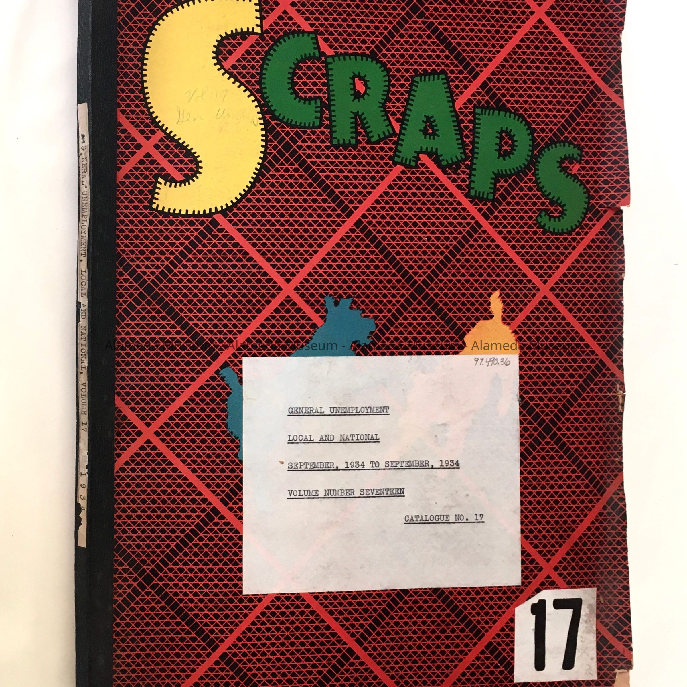 SOFT-BOUND SCRAPBOOK, WITH TYPEWRITTEN PAPER LABEL ON COVER, "GENERAL UNEMPLOYMENT, LOCAL AND NATIONAL, SEPTEMBER 1934 TO SEPTEMBER 1934, VOLUME NO. 17."