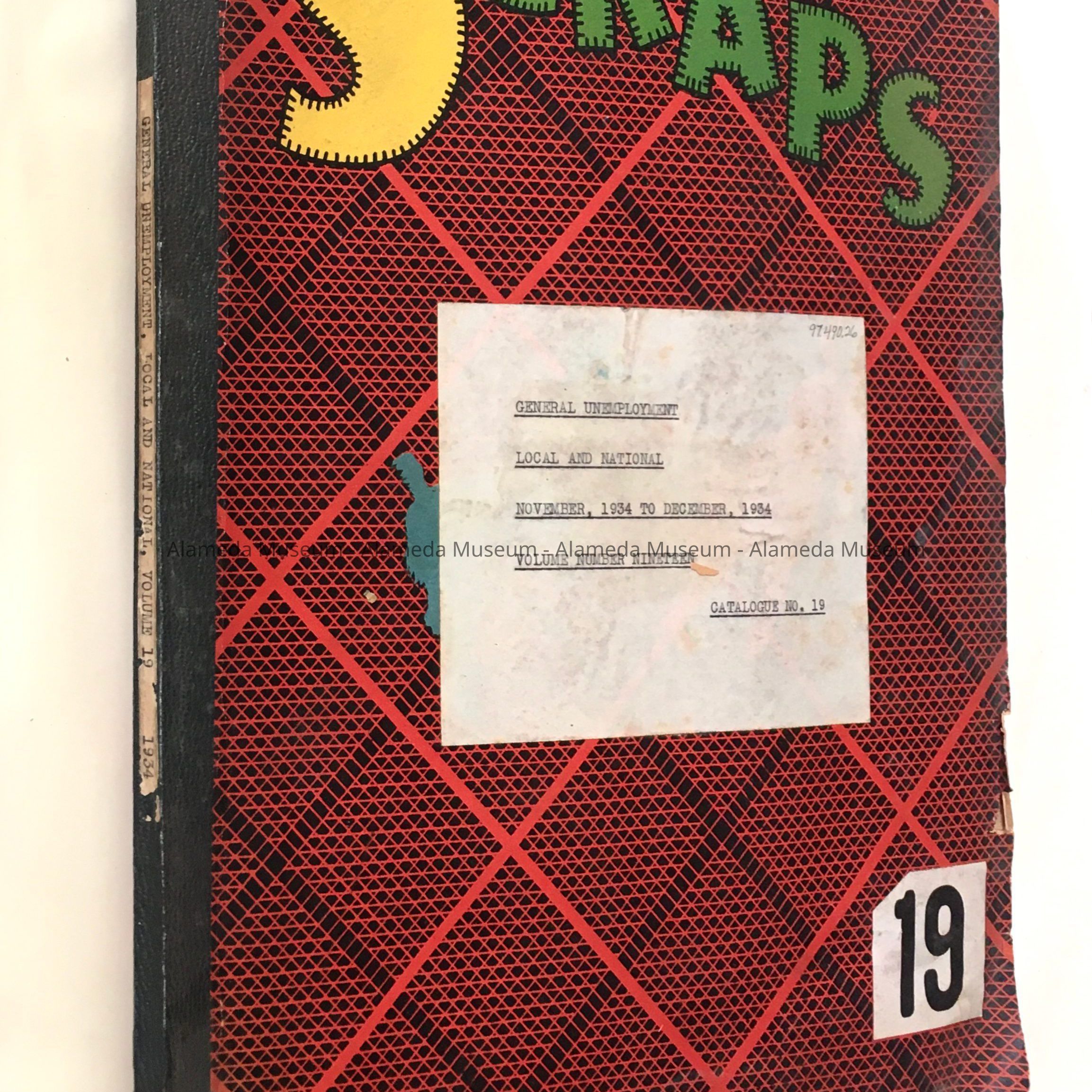 SOFT-BOUND SCRAPBOOK, WITH COVER DESIGN FEATURING THE WORD, "SCRAPS," IN YELLOW-, GREEN-, AND BLACK-COLORED TYPE ON A BLACK-AND-RED CHECKERED BACKGROUND. TYPEWRITTEN PAPER LABEL ON COVER STATES, "GENERAL UNEMPLOYMENT, LOCAL AND NATIONAL, NOVEMBER 1934 TO DECEMBER 1934, VOLUME NO. 19."