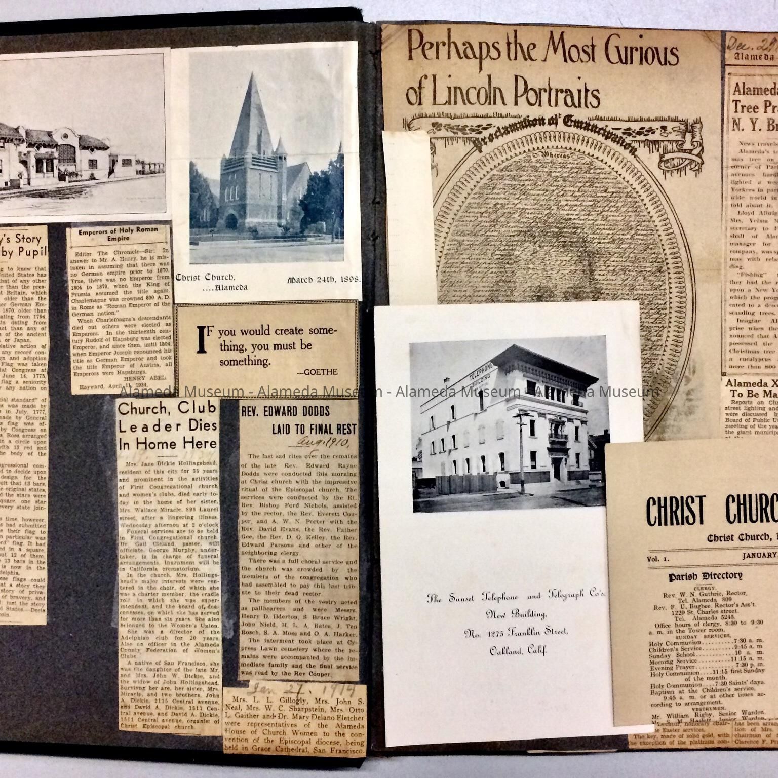HISTORY OF OBJECT: A SCRAPBOOK COMPILED BY LYDIA GILLOGLY, PROMINENT IN ALAMEDA CIVIC AFFAIRS, INCLUDING THE ADELPHIAN CLUB, CHRIST EPISCOPAL CHURCH, ETC.