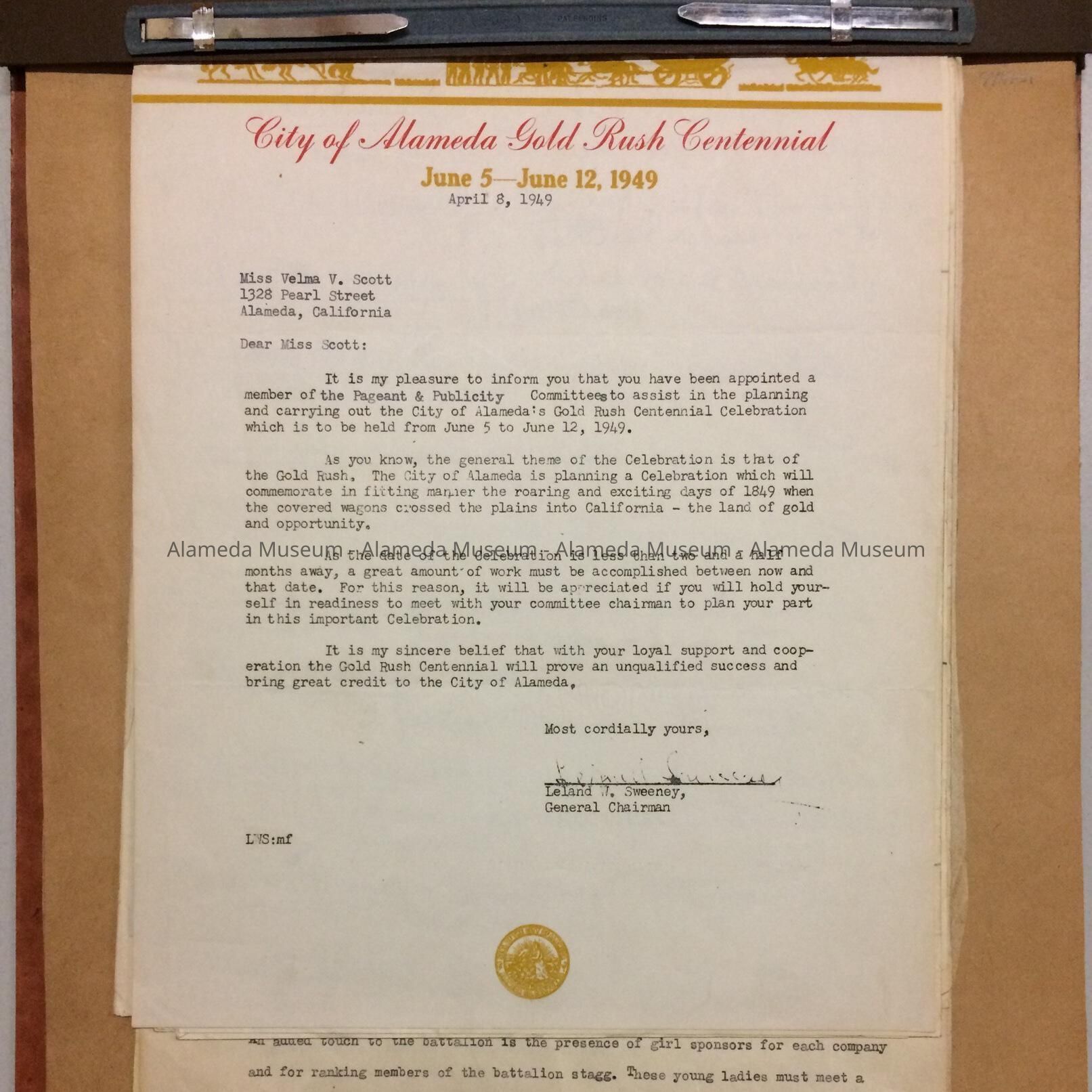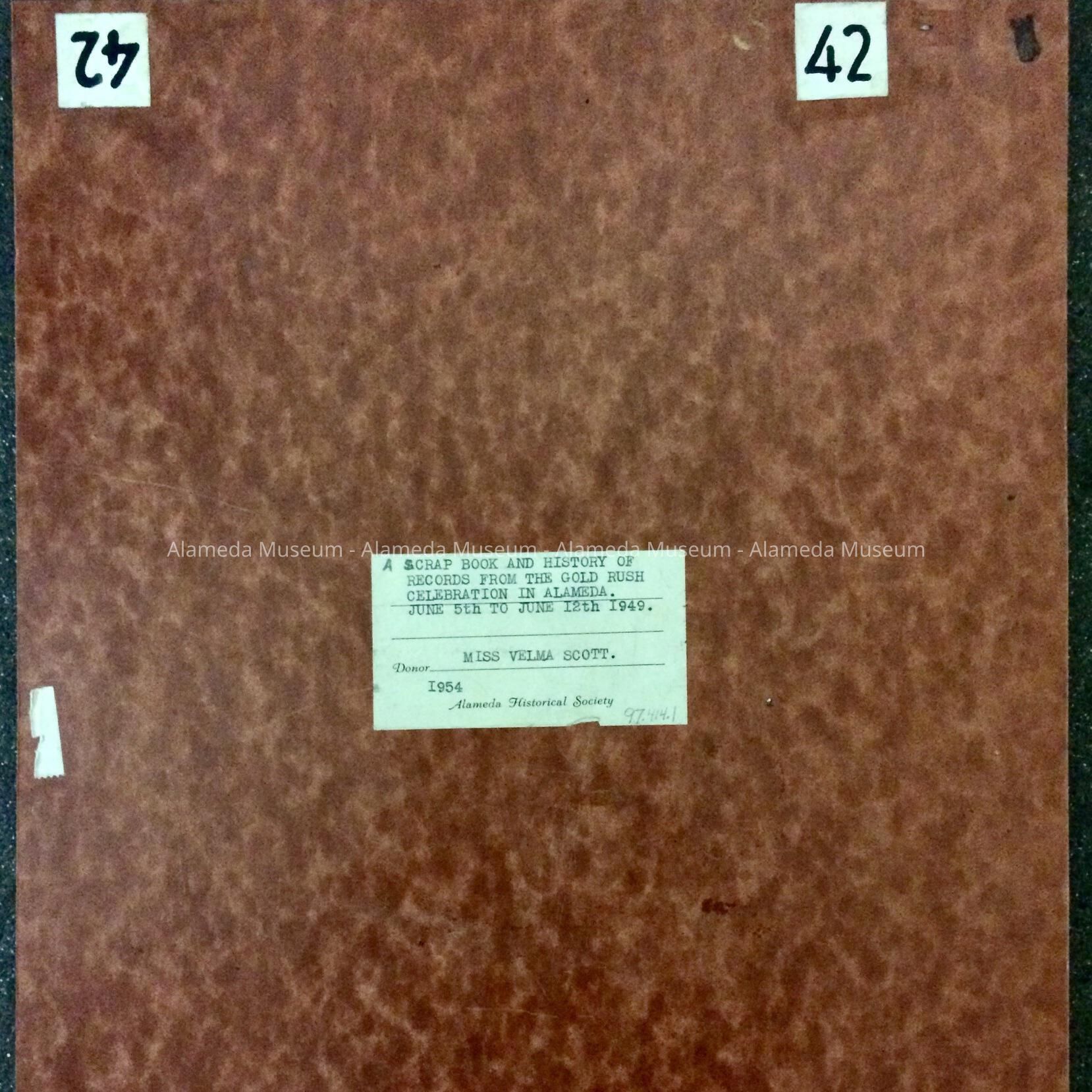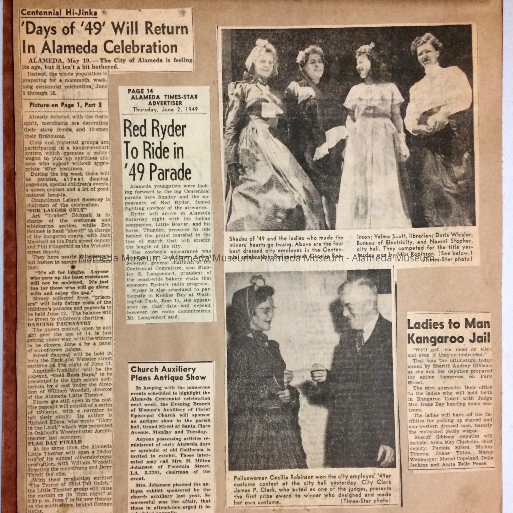 SCRAPBOOK COMPILED BY MRS VELMA SCOTT. BOOK CONTAINS CORRESPONDENCE, PARTICIPATING MEMBERS' WARDROBE, AND VARIOUS EVENTS, INCLUDING A SCRIPT FOR THE CITY OF ALAMEDA'S "GOLD RUSH CENTENNIAL, JUNE 5 THRU 12, 1949." ALSO INCLUDED ARE NEWSPAPER CLIPPINGS CONCERNING THAT EVENT. SCRAP BOOK WAS GIVEN TO THE ALAMEDA HISTORICAL SOCIETY IN 1954, NUMBERED "S-42," AND NOT CATALOGED AT THAT TIME.