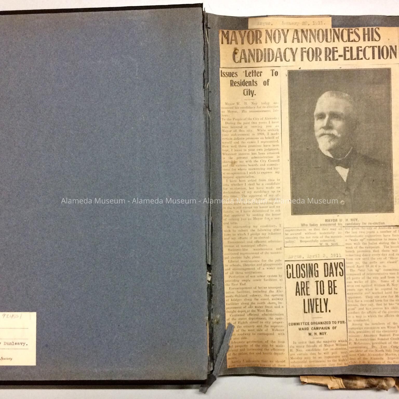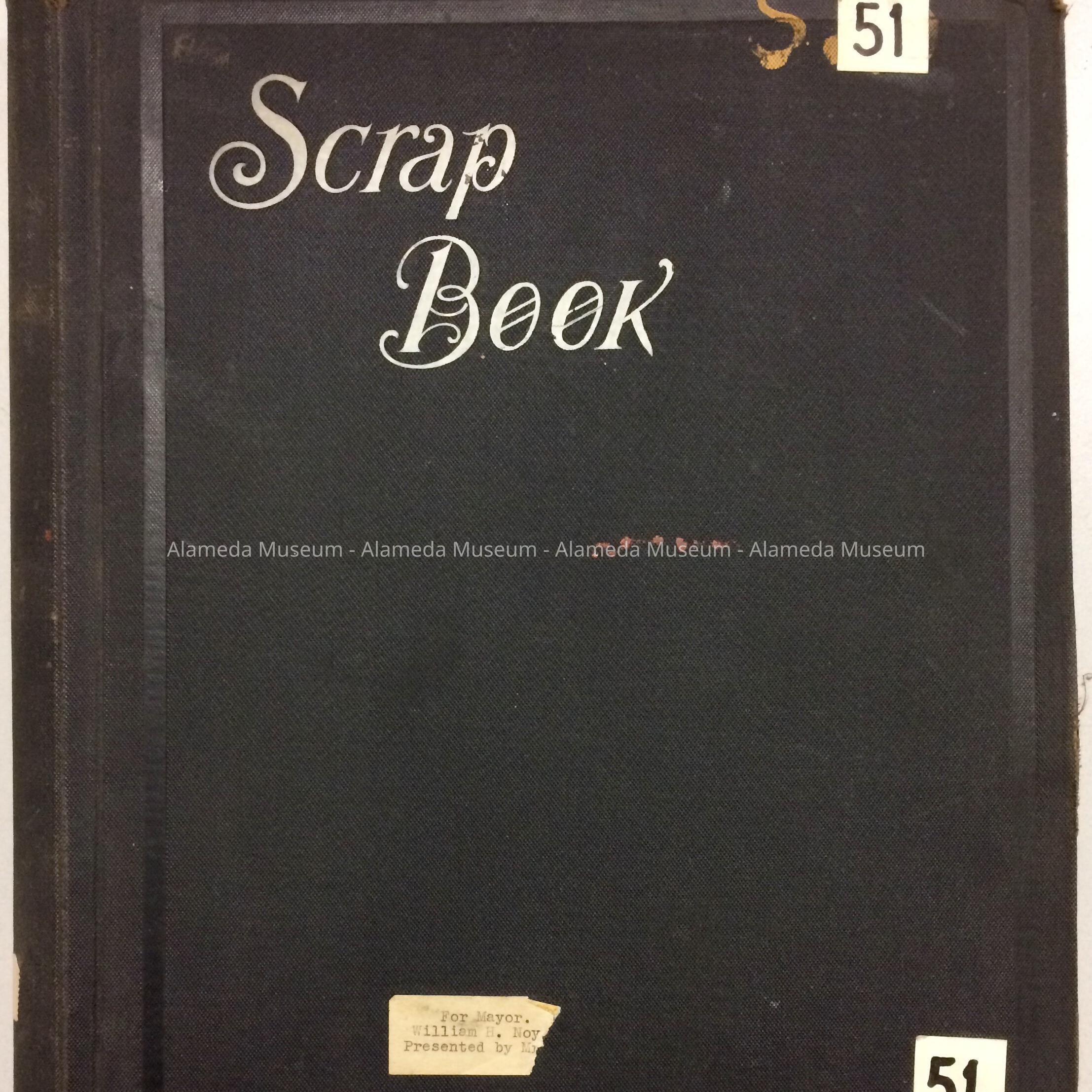 SCRAPBOOK COMPILED BY THE LATE FORMER MAYOR W H NOY. SCRAP BOOK CONTAINS CLIPPINGS CONCERNING NOY'S ADMINISTRATION AND OTHER POLITICAL ACTIVITIES WITHIN ALAMEDA. THERE ARE ALSO CLIPPINGS CONCERNING THE DEATH OF FIRE CHIEF, FREDERICK KRAUTH. ALBUM WAS GIVEN TO THE ALAMEDA HISTORICAL SOCIETY, NUMBERED "S-51," IN 1952, BY HONORABLE W H NOY'S DAUGHTER, LAVINIA, AND NOT PREVIOUSLY CATALOGED.