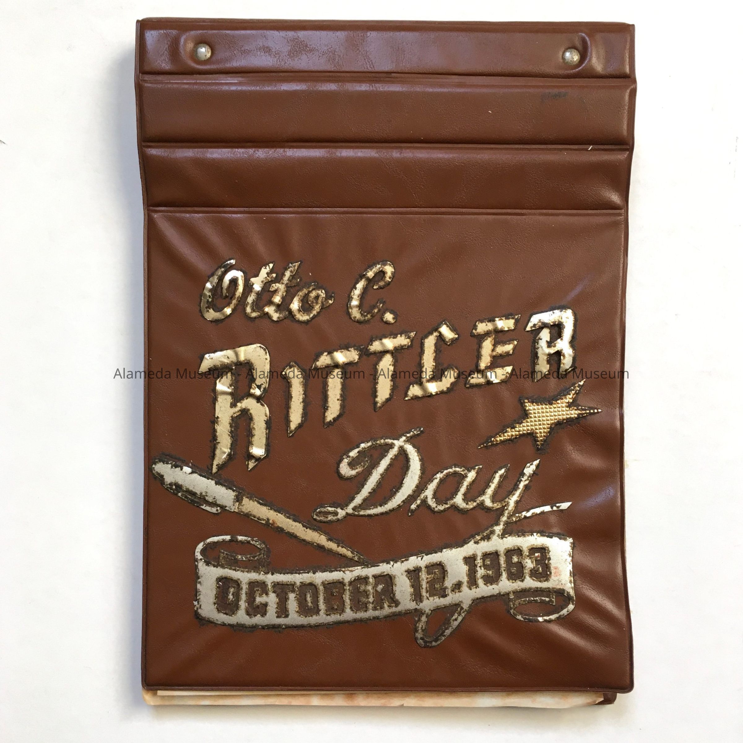 Description: A scrapbook with brown plastic covers; front cover has caption Otto C. Rittler Day, October 12, 1963, written in light brown script; the date appears on an unfurled banner, and the design includes a star and a pen. Glued on the first page is the program for a testimonial dinner, honoring Otto C, Rittler, held at the Hotel Alameda Ball Room, Saturday, October 12, 1963. Next 14 pages consist of signatures of those who were present at the dinner. Next 10 pages have newspaper clippings concerning the testimonial dinner glued in. A park site was dedicated to Rittler on that day at 1 p.m. and the dinner was planned by city officials as the evening event. AAHMES Shrine patrol and band escorted city dignitaries to dedication site. Sheets of scrapbook are imitation parchment.