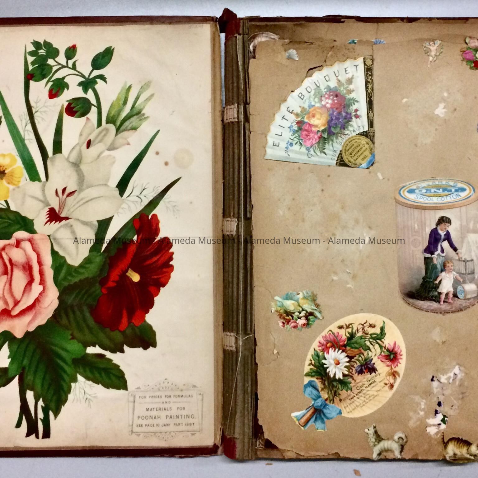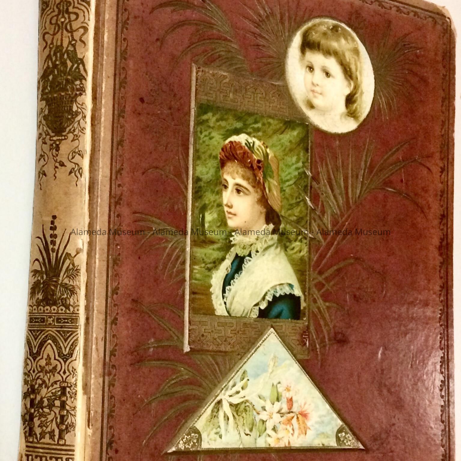 History of Object: Scrapbook containing advertising cards, cut-outs, etc., compiled by Agnes Louise (1863-1950), daughter of Thomas A. &c Katherine Thomsen, of 2114 Encinal Avenue. In 1886 she married Charles F. Fischer, stepson of Denis Straub, pioneer carpenter-builder of Alameda. The Fischer's were the parents of Maude E. Fischer Baker, mother of the donor.