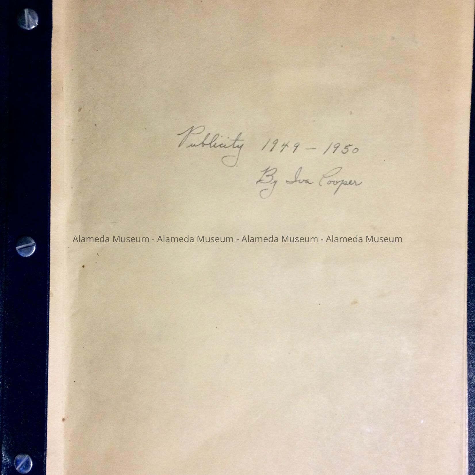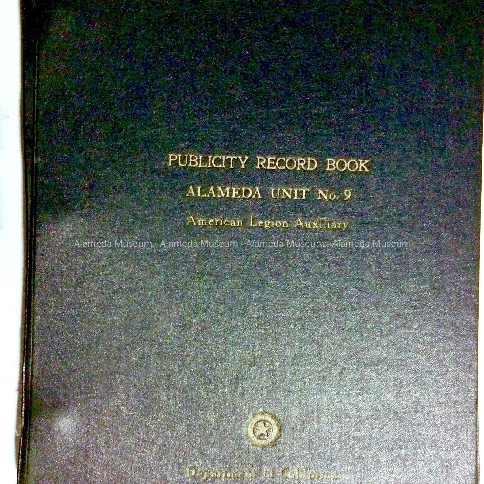 Hard cover (navy blue colored) loose-leaf scrap book with incised printed caption (in gold) " Publicity Record Book Alameda Unit No. 9"