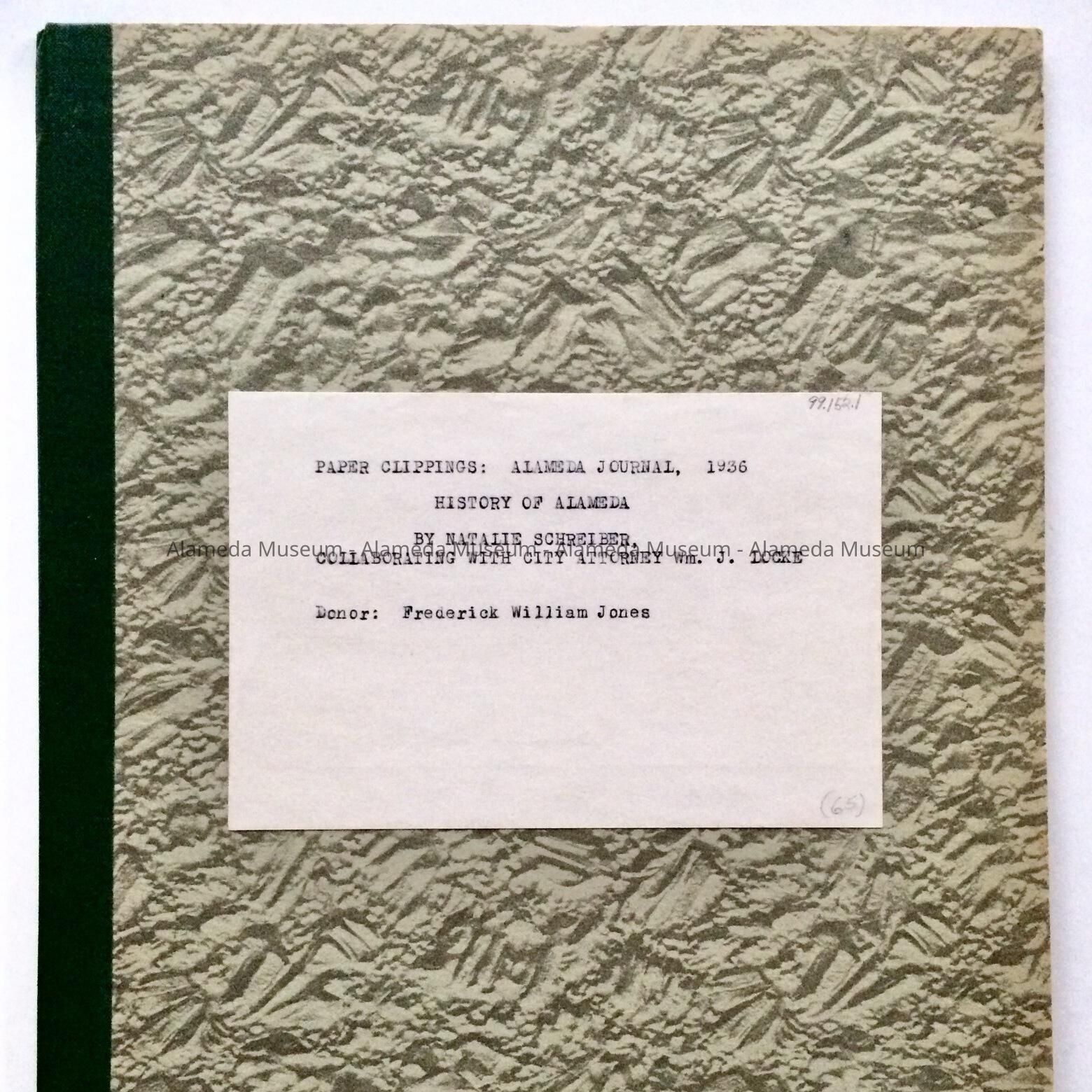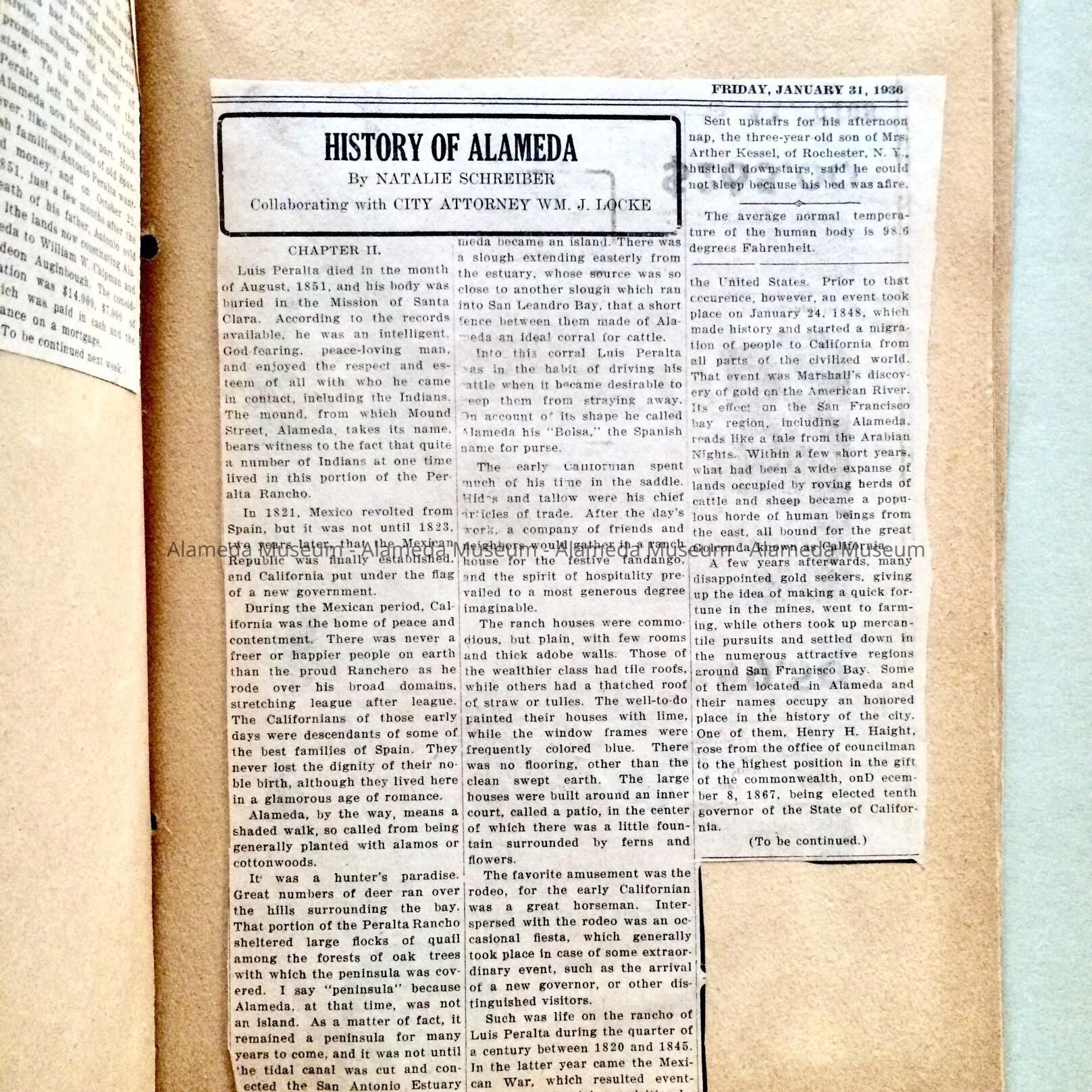 History: Newspaper clippings concerning the history of Alameda, extracted from the Alameda Journal, 1936. The author, Natalie Schreiber, collaborated with City Attorney William J. Locke to produce the articles. Object given to the Alameda Historical Society prior to 1971 and never catalogued.