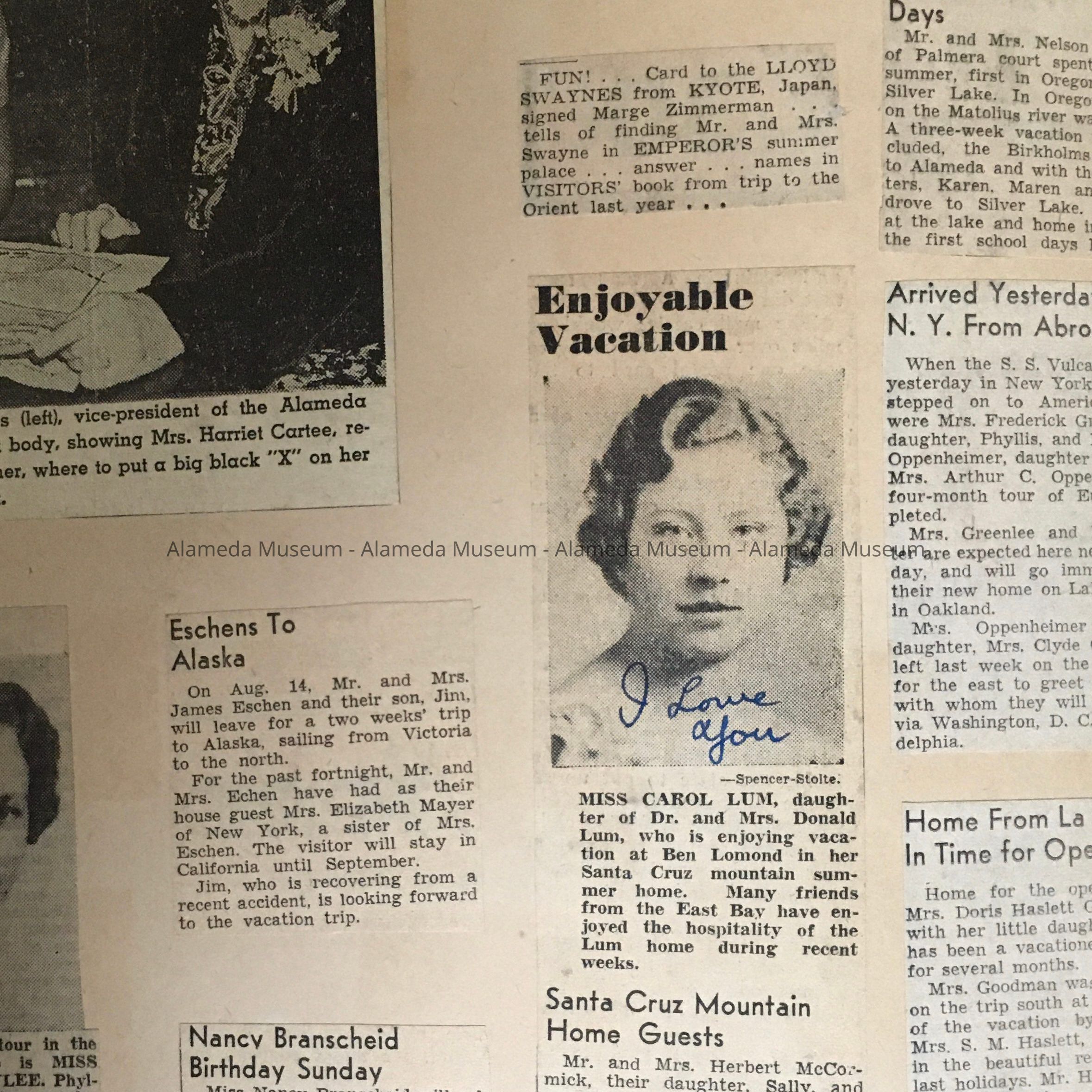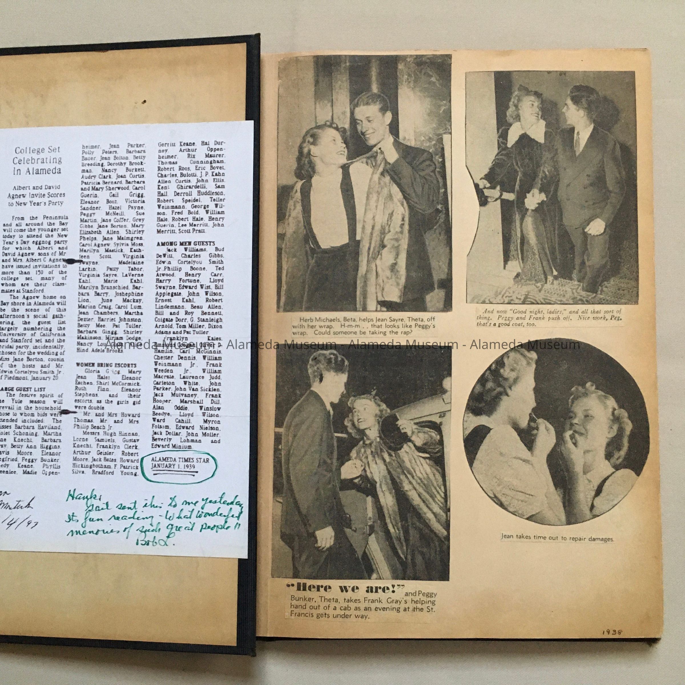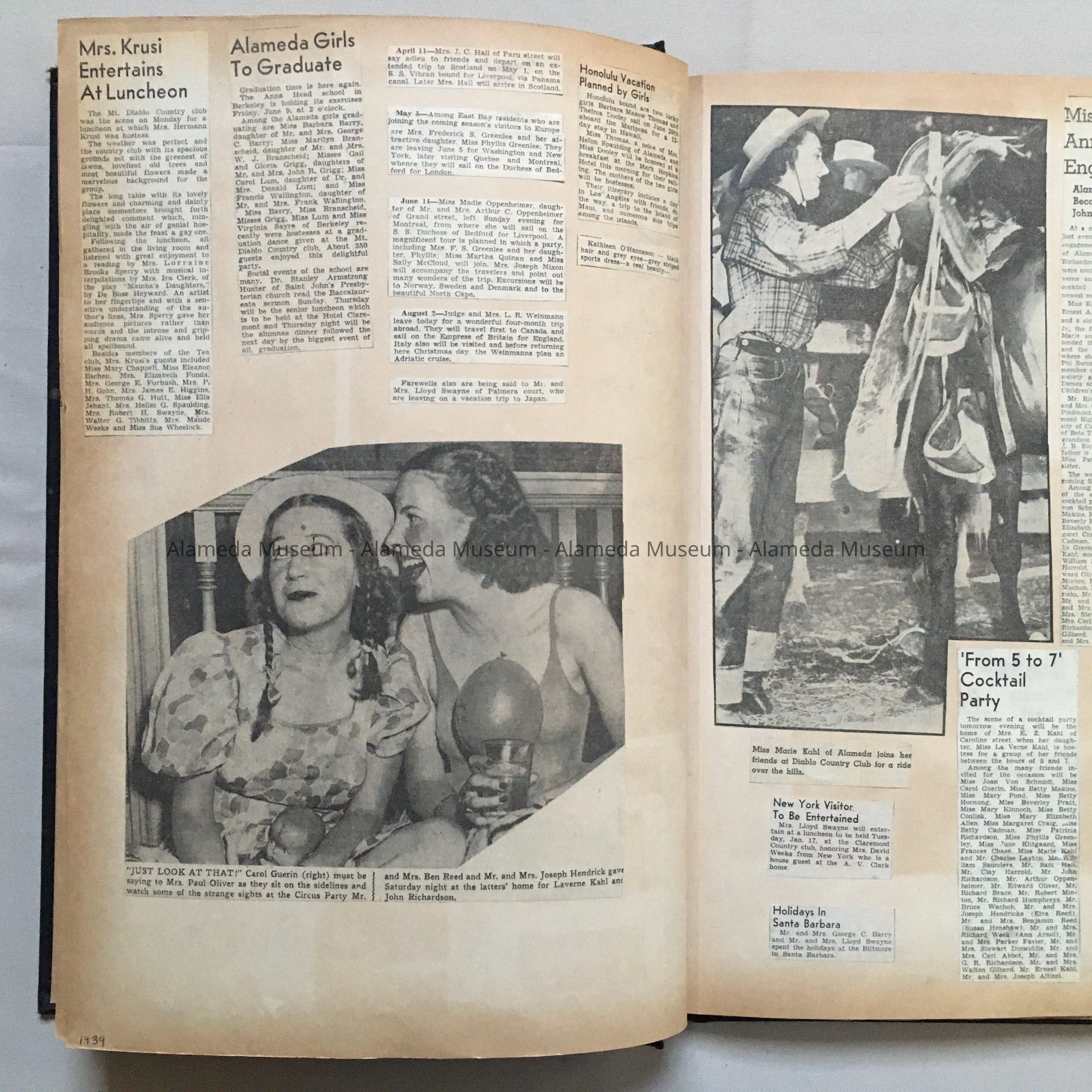 History of Object: Scrapbook composed by Carol Lum, a daughter of Dr. Lum, involved in the Board of Education. Lum school (closed) was named after him. The scrapbook is filled with clippings from local newspapers of the time, reflecting the life of a young, affluent, white woman in her years at U.C. (Cal.) Berkeley, on the brink of WWII. A few clippings mention Dr. Lum’s career. Most clippings relate to young women she knew from Alameda, as they get married and are involved in social and/or charity activities. One clipping from 1939 shows a friend brought back a gas mask from a trip to London.