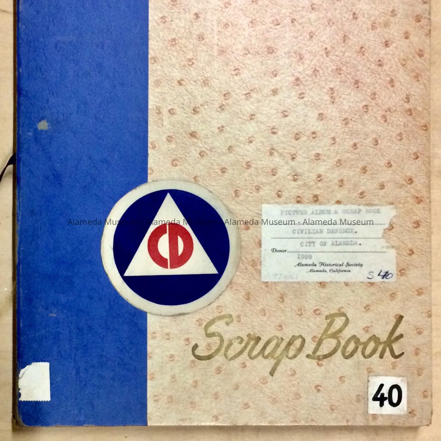 ALBUM CONTAINING NEWSPAPER CLIPPINGS AND PHOTOGRAPHS CONCERNING ALAMEDA CIVIL DEFENSE FROM THE PERIOD 1950 TO 1955. - ALBUM IS NUMBERED "S-40." SCRAP BOOK WAS ORIGINALLY GIVEN IN 1959 TO THE ALAMEDA HISTORICAL SOCIETY AND NOT CATALOGED AT THAT TIME.