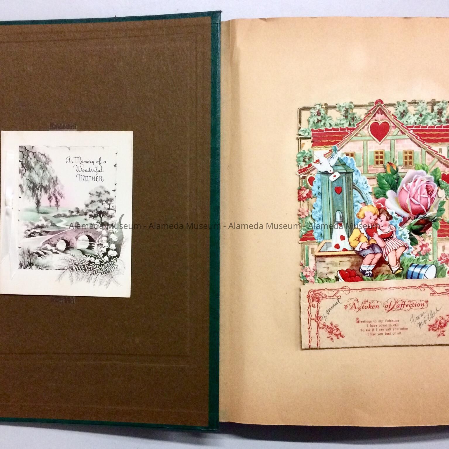 A SCRAPBOOK CONTAINING GREETING CARDS, COMPILED BY ROSE KRUEGER, WHO RESIDED AT 3246 LIBERTY AVENUE, ALAMEDA. SHE ATTENDED ALAMEDA SCHOOLS. THE GREETING CARDS REPRESENT THE 1939'S THRU THE 1950's. ROSE WAS THE LATE AUNT OF THE DONOR.