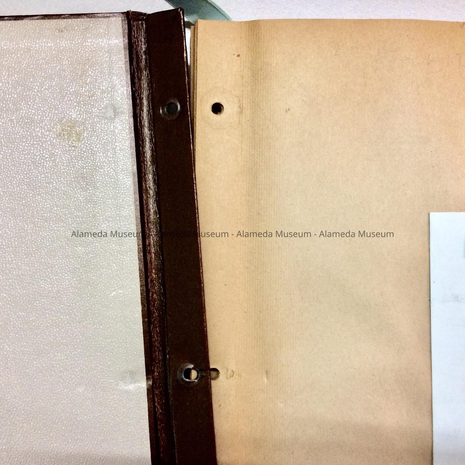 A BINDER-STYLE SCRAPBOOK, WITH HARD COVER OF BROWN-COLORED PLASTIC.