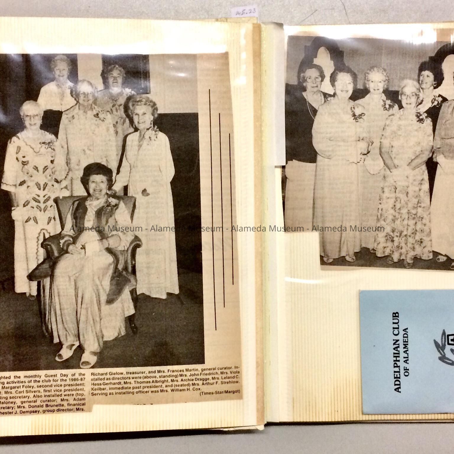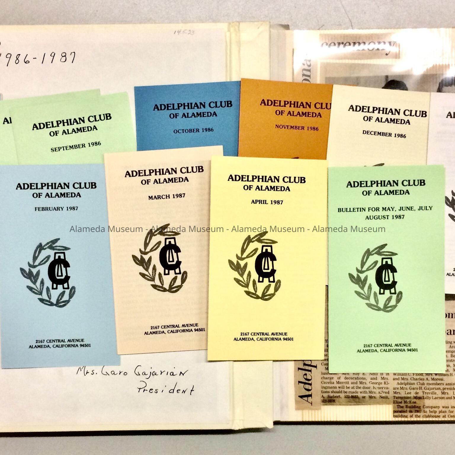 A SCRAPBOOK COMPILED DURING THE PRESIDENCY OF MRS GAROGAGARIAN, 1986-87. MRS GAROGAGARIAN WAS AN ALAMEDA MUSEUM DOCENT FOR SEVERAL YEARS.