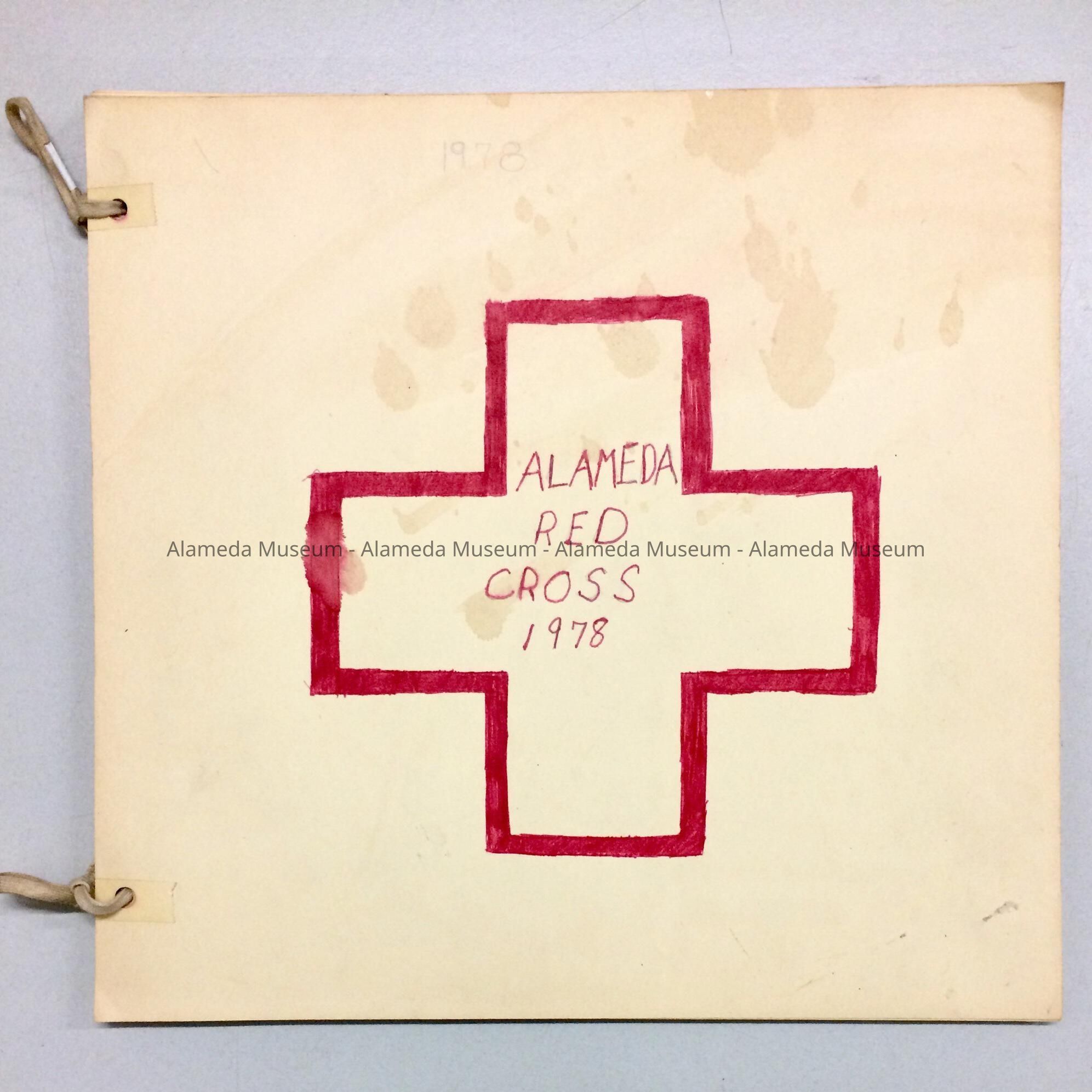A HOME-MADE SCRAPBOOK, WITH MANILA-COLORED PAPER. SHOE LACES SERVE AS BINDING. COVER HAS A HAND DRAWN RED-COLORED CROSS, WITH CAPTION, "ALAMEDA RED CROSS, 1978," IN RED-COLORED FELT PEN.