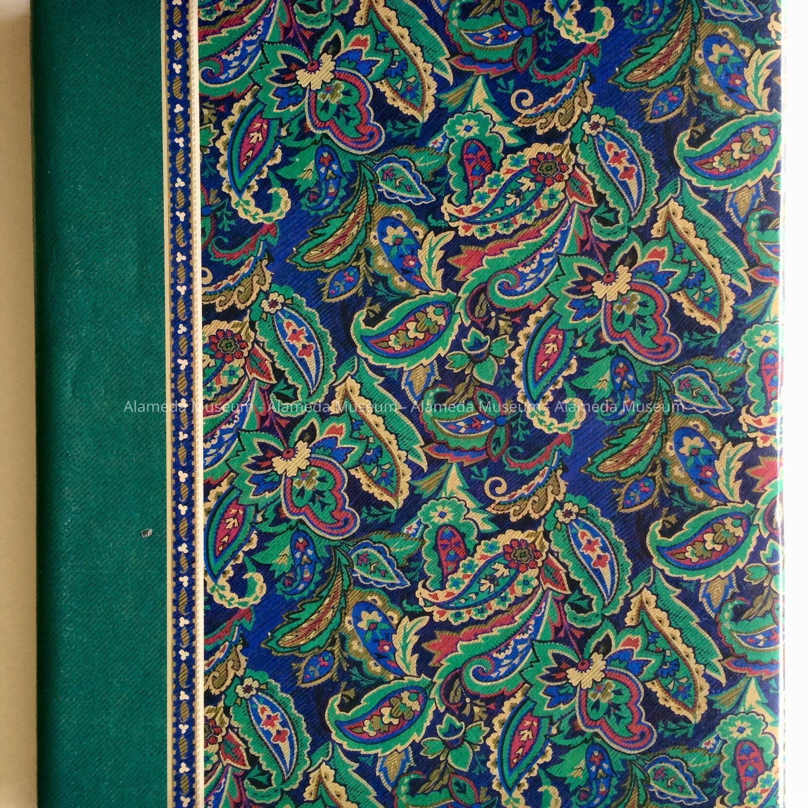 A LOOSE-LEAF PHOTO ALBUM, HARD COVER OF GREEN AND MULTICOLORED PAISLEY, PLASTICIZED.
