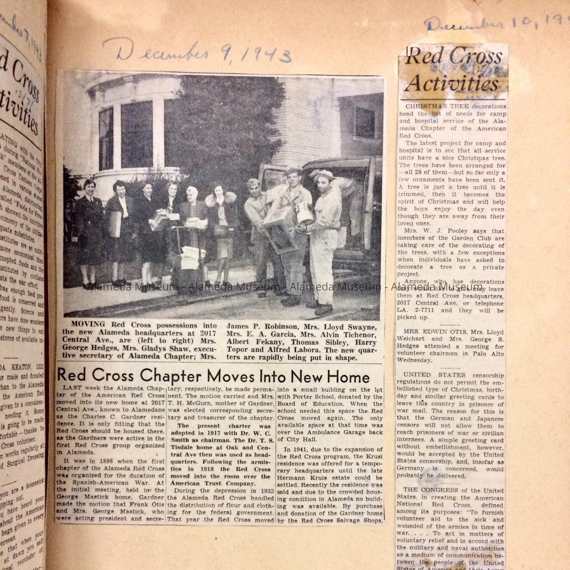 A SCRAPBOOK CONTAINING NEWSPAPER CLIPPINGS FROM THE PERIOD MARCH THROUGH DECEMBER 1943, PERTAINING TO ACTIVITIES OF THE ALAMEDA CHAPTER OF THE AMERICAN RED CROSS.