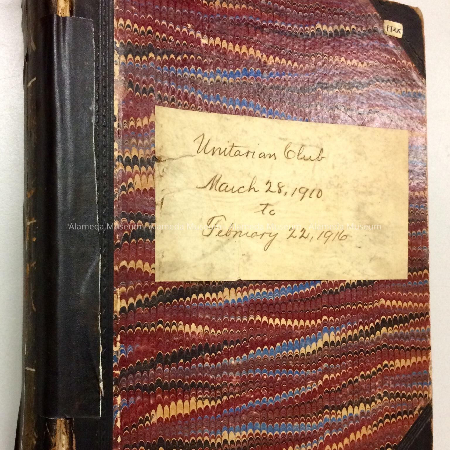 HARD-BOUND VOLUME, WITH COVER DESIGN FEATURING MULTI-COLORED WAVY PATTERN, TRIMMED IN BLACK-COLORED LEATHER. COVER HAS ATTACHED PAPER LABEL, WITH HANDWRITTEN CAPTION, "UNITARIAN CLUB, MARCH 28, 1910' TO FEBRUARY 22, 1916."