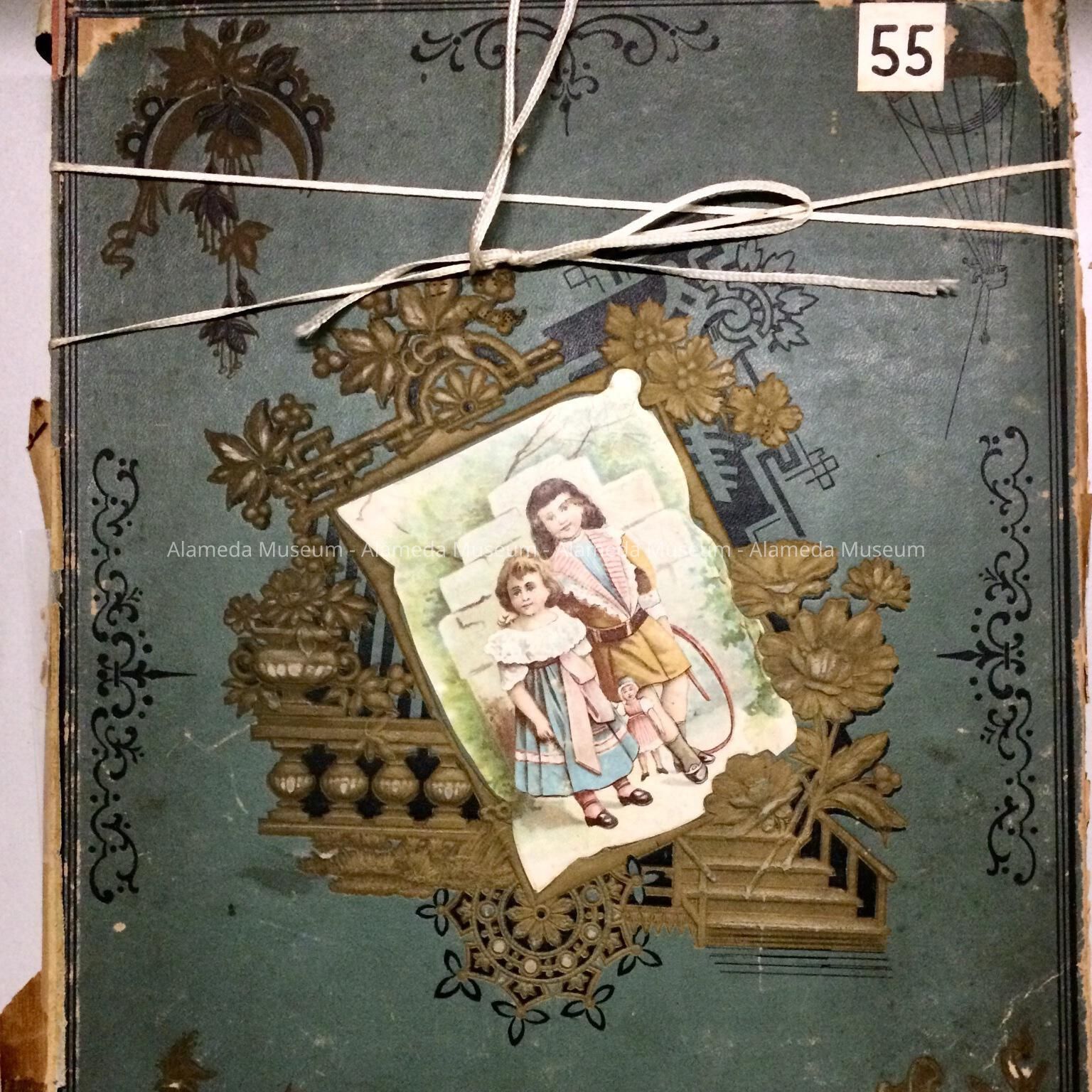 HARD-BOUND ALBUM, WITH DECORATIVE COVER FEATURING LITHOGRAPH DEPICTING CHILDREN SURROUNDED BY EMBOSSED DESIGN IN GILT AND BLACK-COLORED TYPE.