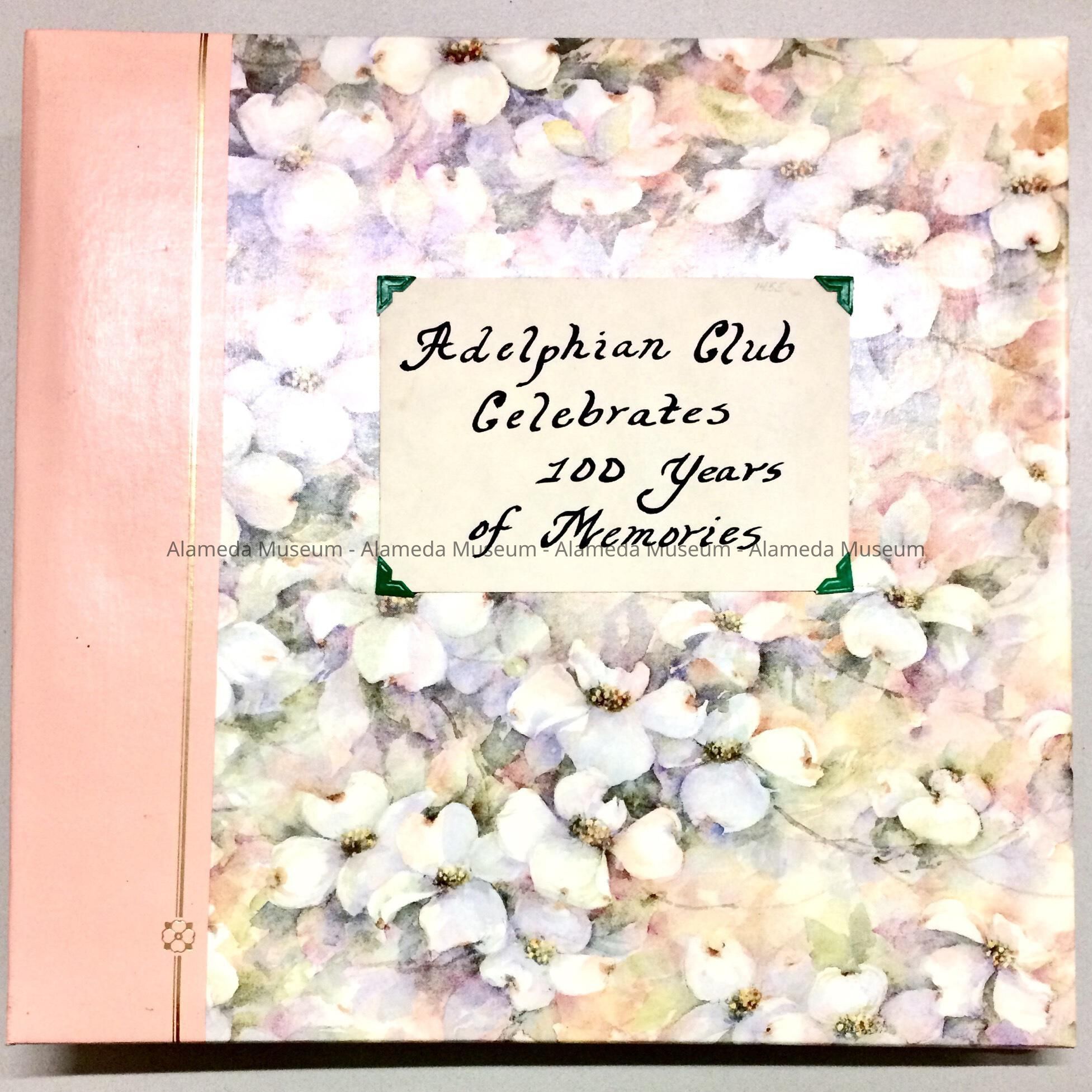 A MODERN LOOSE-LEAF PHOTOGRAPHIC SCRAPBOOK ALBUM. THE ALBUM HAS A DECORATIVE COVER DEPICTING PASTEL COLORED FLOWERS AND LEAVES AND A HANDWRITTEN CAPTION, "ADELPHIAN CLUB CELEBRATES 100 YEARS OF MEMORIES."