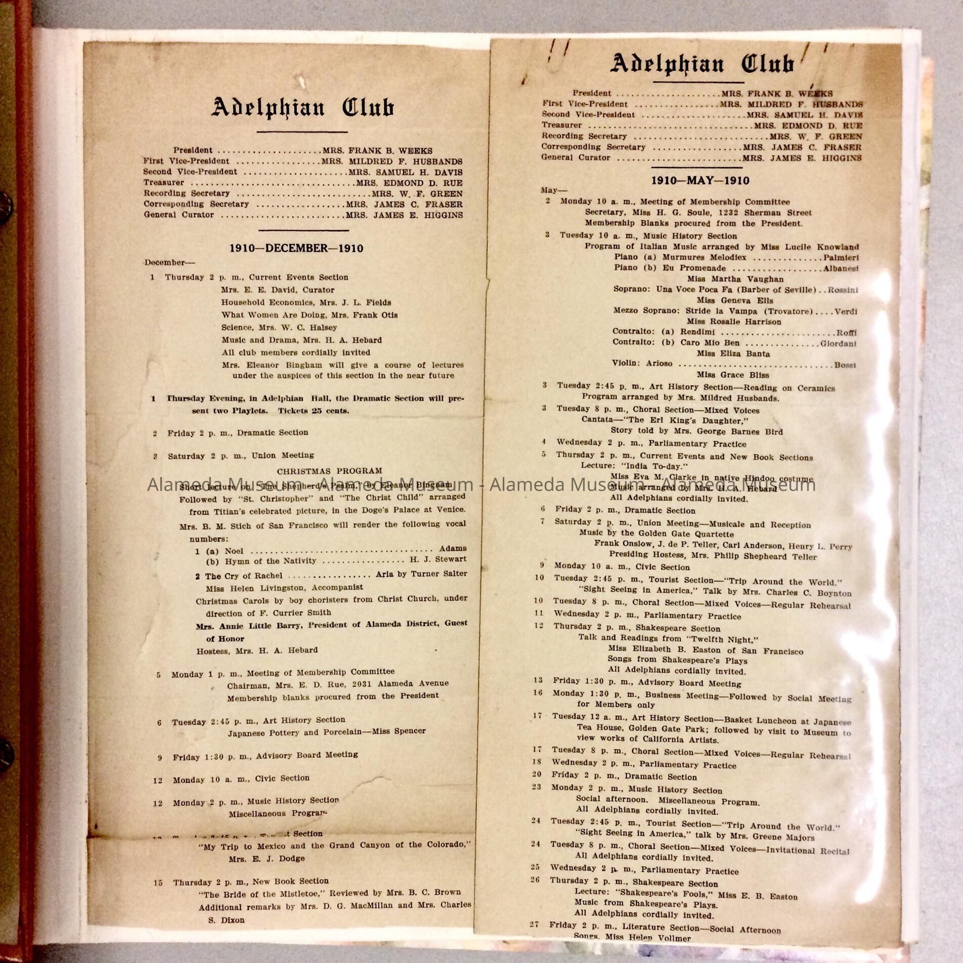 A SCRAPBOOK CONTAINING PRINTED INFORMATION CONCERNING EVENTS SCHEDULED DURING A SINGLE MONTH, COMMENCING WITH JANUARY 1911. ALSO INCLUDED IS THE LIST OF OFFICERS PRESIDING EACH PARTICULAR YEAR.