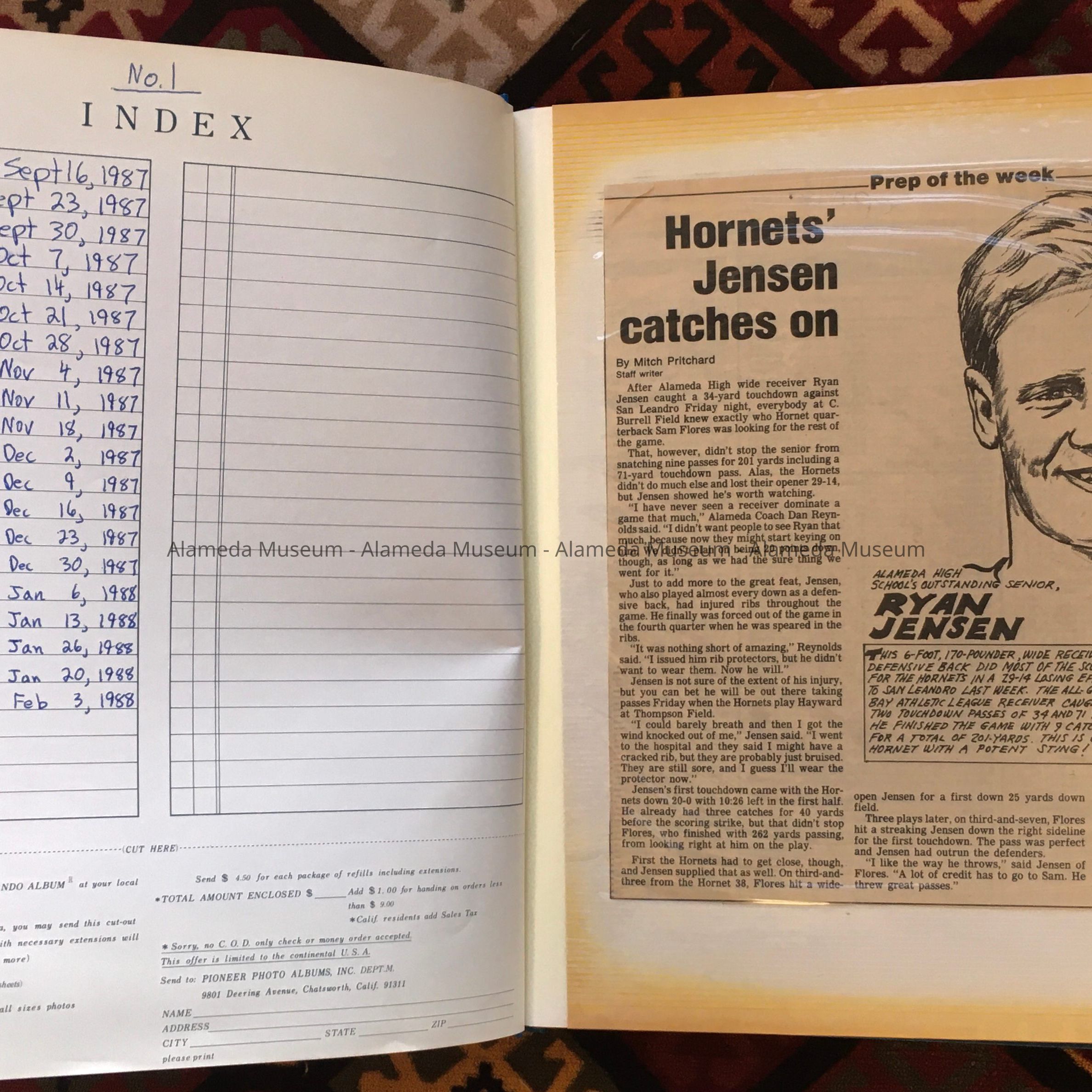 History: A Scrapbook of clippings of a column by Mitch Pritchard, Staff Writer, that appeared in the Alameda Times Star, reporting on promising athletes from Alameda High Schools (Alameda, Encinal, and St. Joe (Saint Joseph)). The articles date from Sept 16, 1987, to Feb 3, 1988.