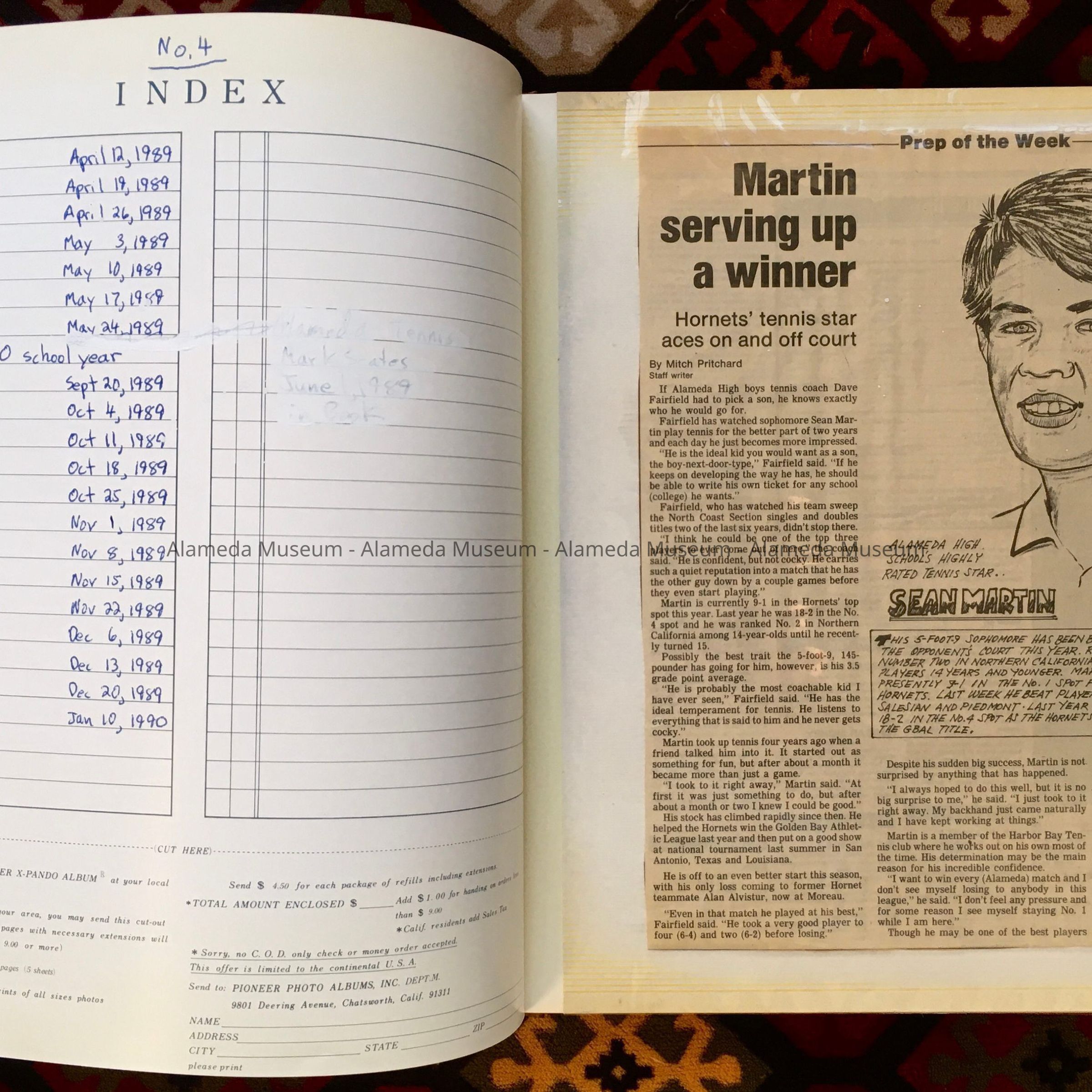 History: A Scrapbook of clippings of a column by Mitch Pritchard, Staff Writer, that appeared in the Alameda Times Star, reporting on promising athletes from Alameda High Schools (Alameda, Encinal, and St Joe (Saint Joseph)). The articles date from April 12, 1989, to Jan. 10, 1990.