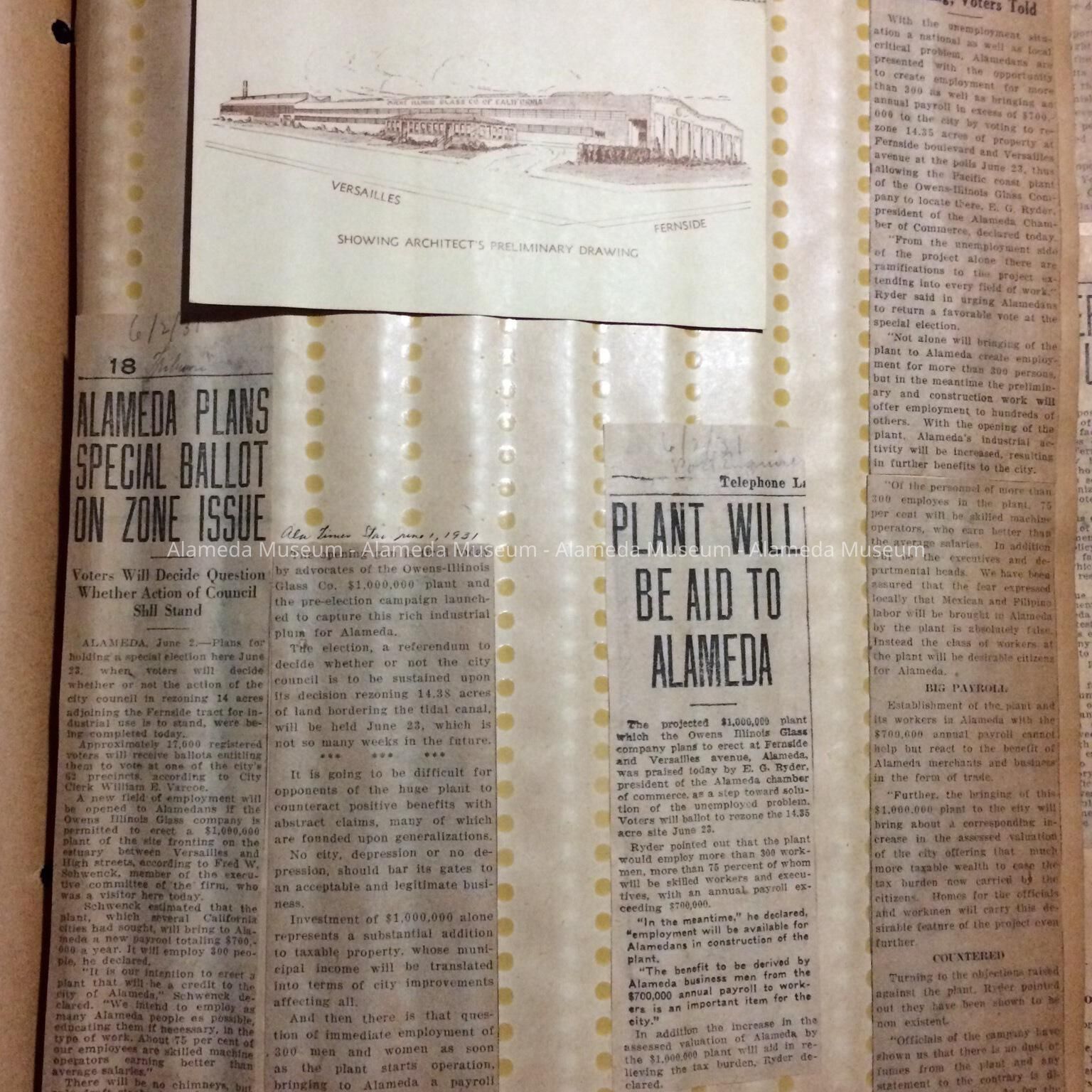 concerning the proposed construction of an Owens-Illinois Glass Company plant, at Versailles Avenue & Fernside Blvd., in 1931. The clippings relate to the attempted rezoning of the area and the agitation it caused among local residents.