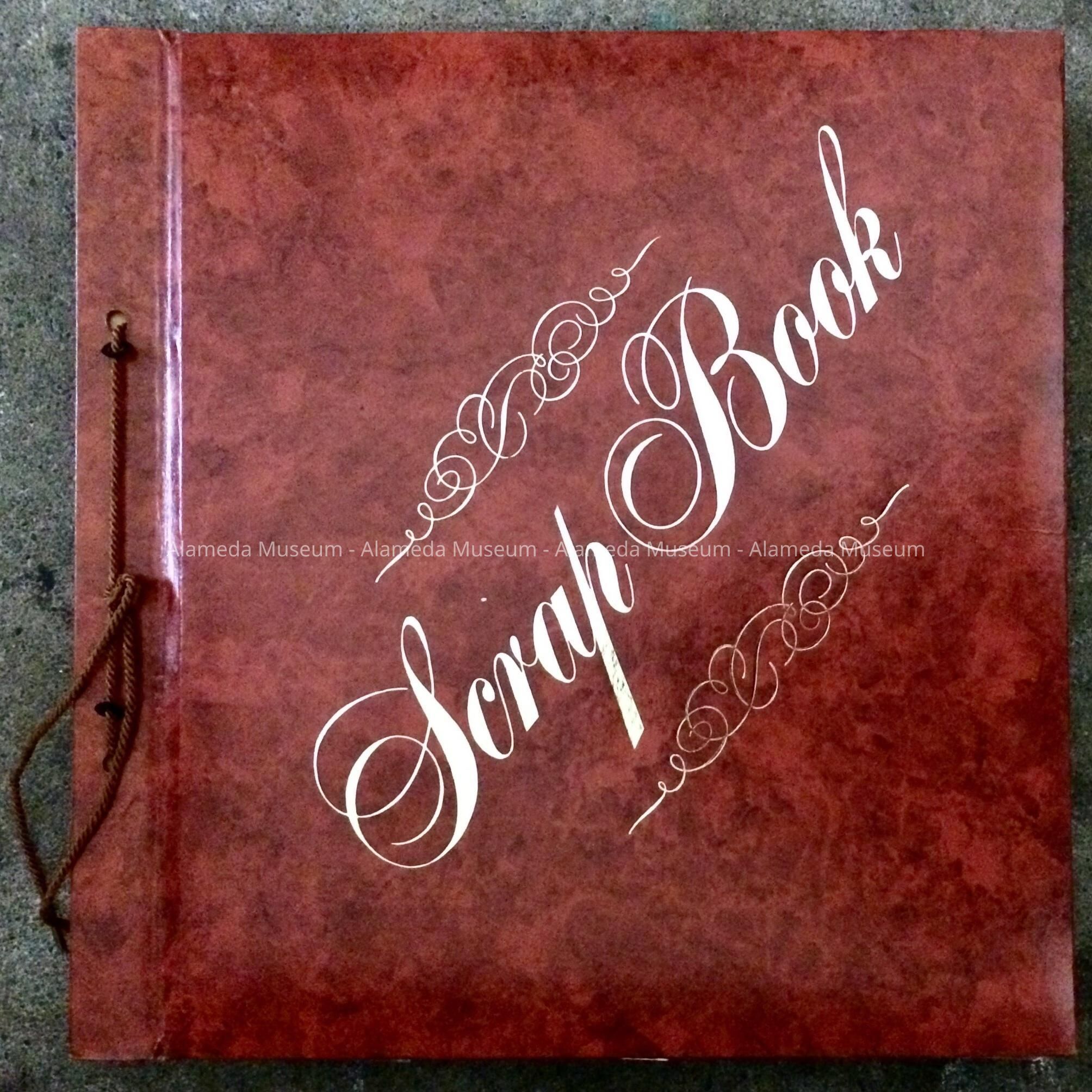 Description: Loose leaf scrapbook, with a hard cover of plasticized cardboard of a rose color with the caption "Scrapbook" in gold colored type.