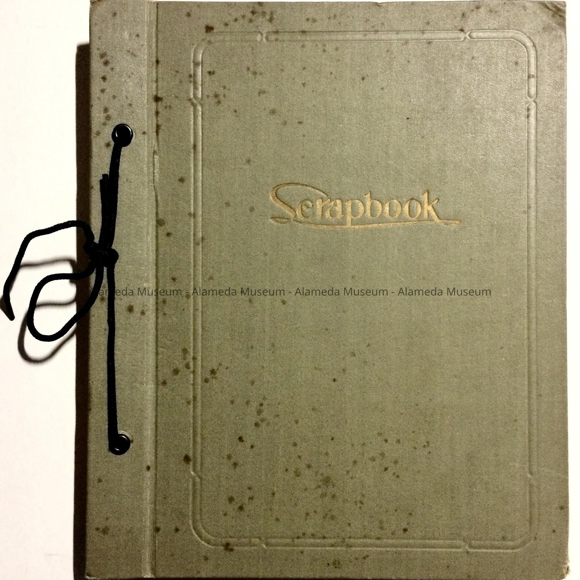 Description: Hard cover (grey colored) loose-leaf scrap book with incised printed caption (in gold) Scrapbook."