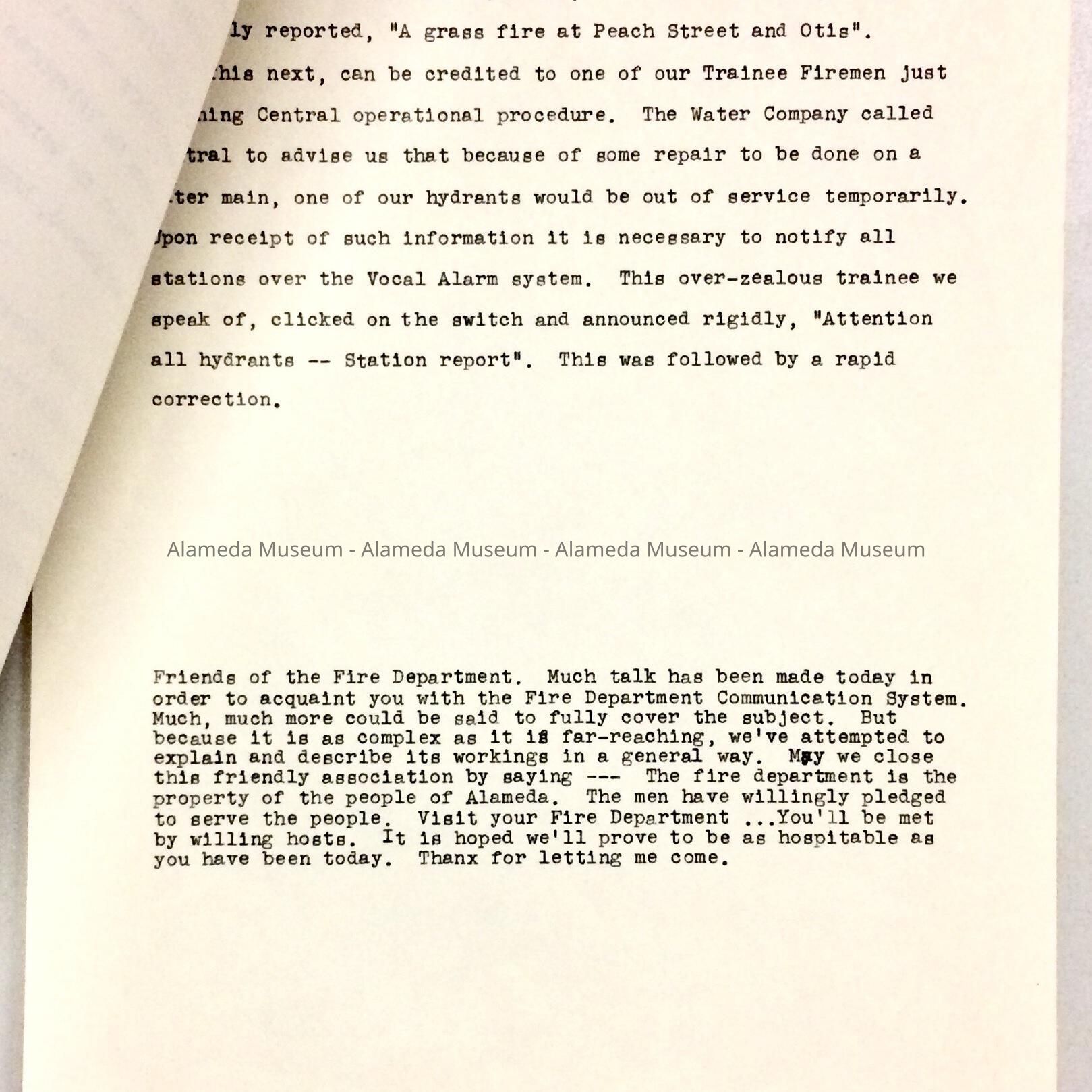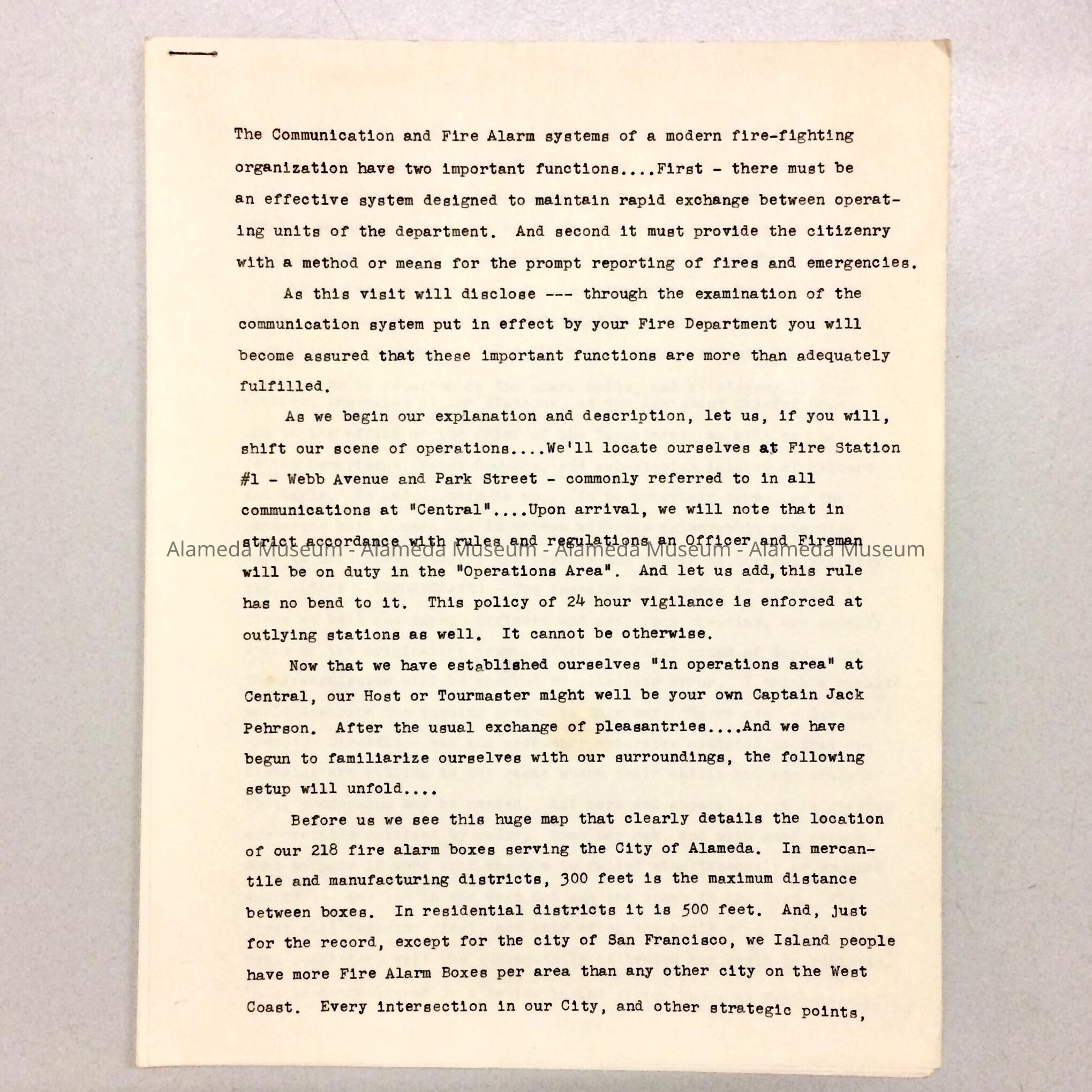 History of Object: Possibly a script for oral presentation on functions of Alameda Fire Dept.