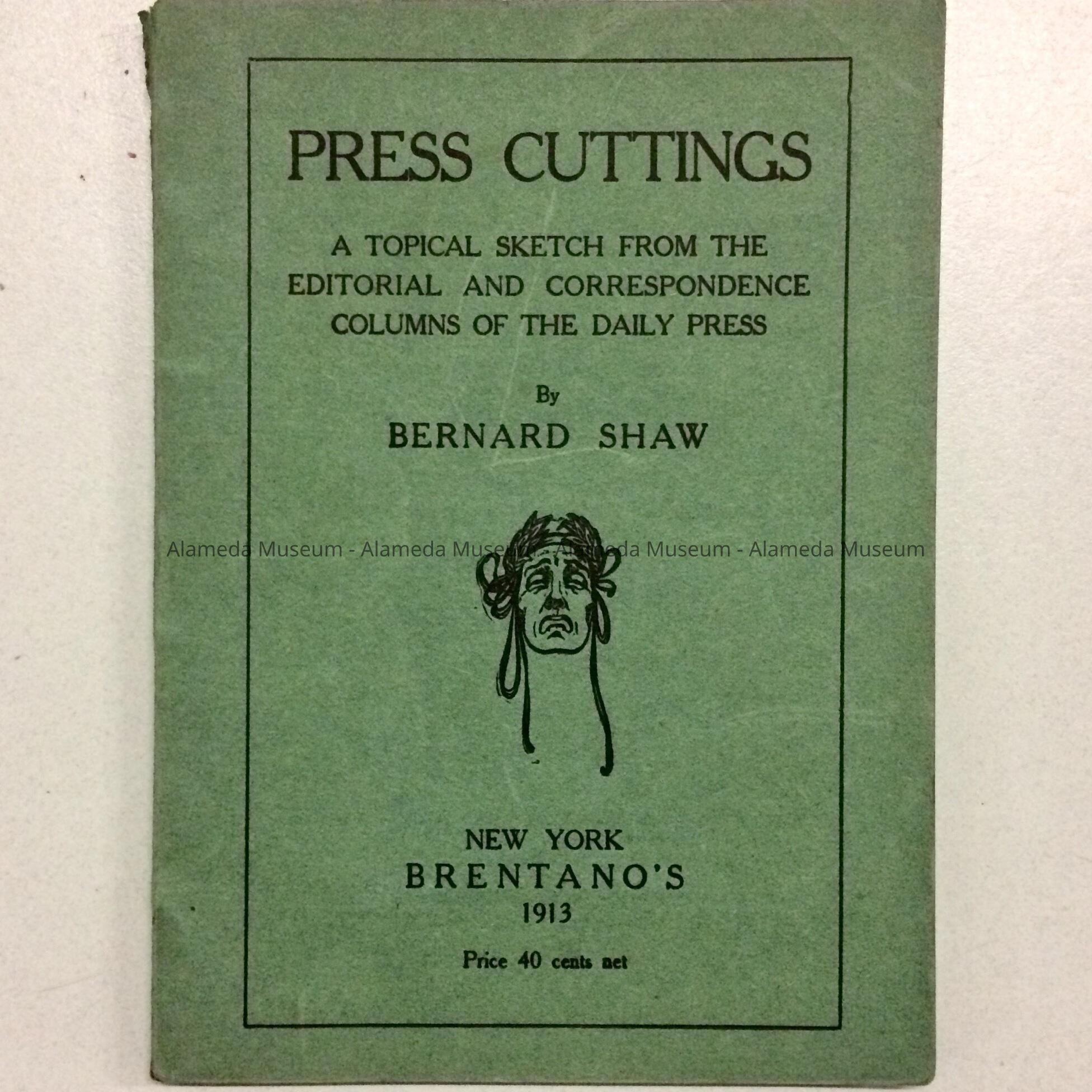 DESCRIPTION: A SOFT BOUND BOOKLET WITH A COVER OF GREEN COLORED HEAVY STOCK PAPER WITH THE BOLD PRINTED CAPTION, "PRESS CUTTINGS" IN BLACK COLORED TYPE ON A GREEN COLORED BACKGROUND.