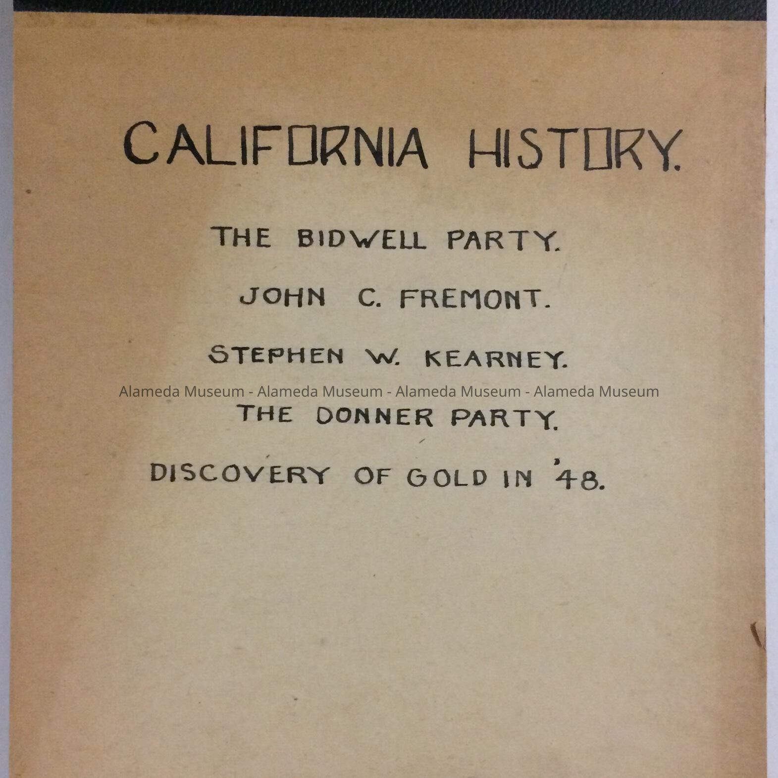 History of Object: Script entitled "California History" (The Bidwell Party John C. Fremont-Stephen W. Kearney-The Donner Party & Discovery of Gold in ‘48) presented on radio by the Alameda City Schools in 1938. Directed by Erle A. Kenney.