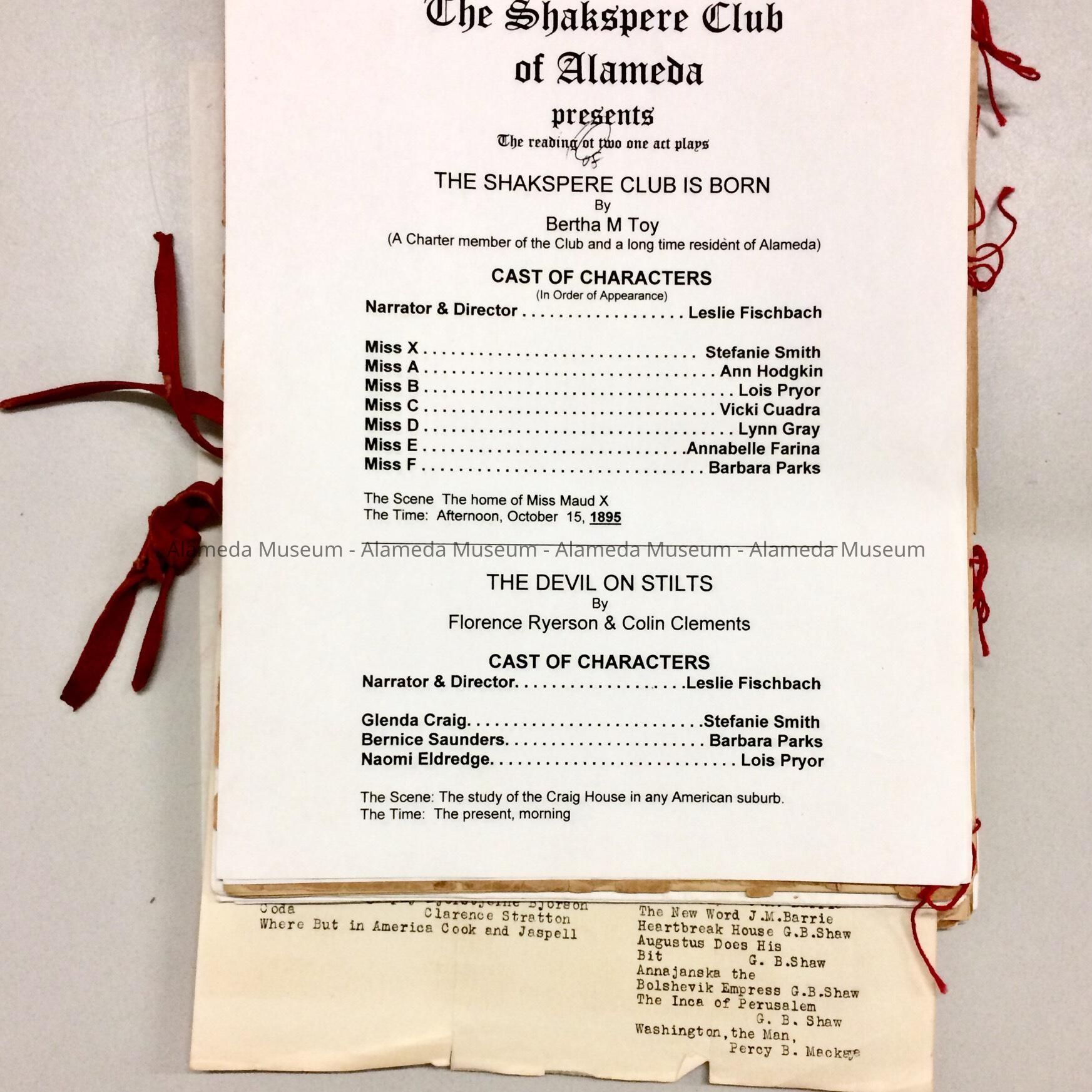 HISTORY OF OBJECTS: SCRIPT COPIES TO THE PLAY, "THE SHAKSPERE CLUB," WRITTEN BY BERTHA M. TOY, A CHARTER MEMBER OF THE CLUB.