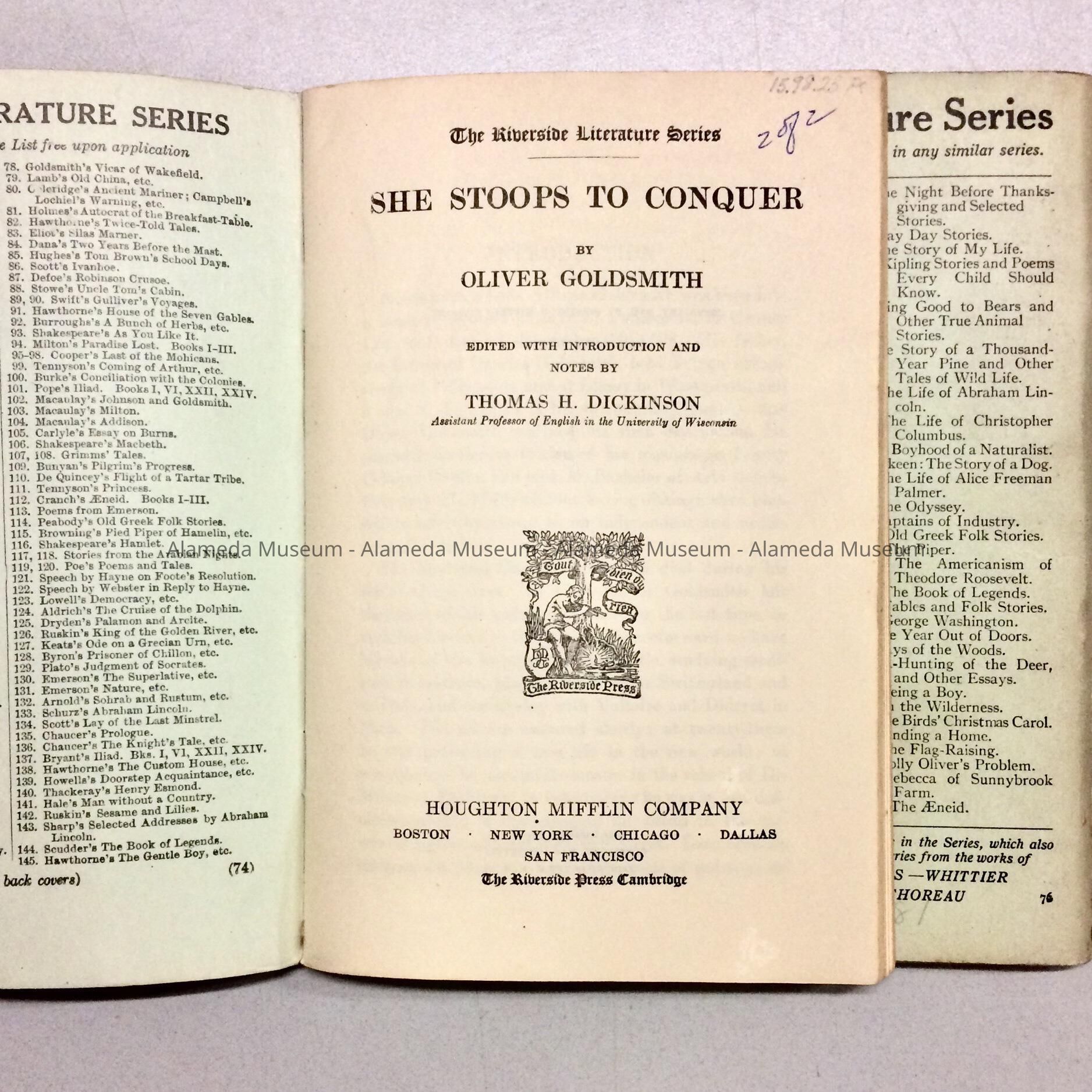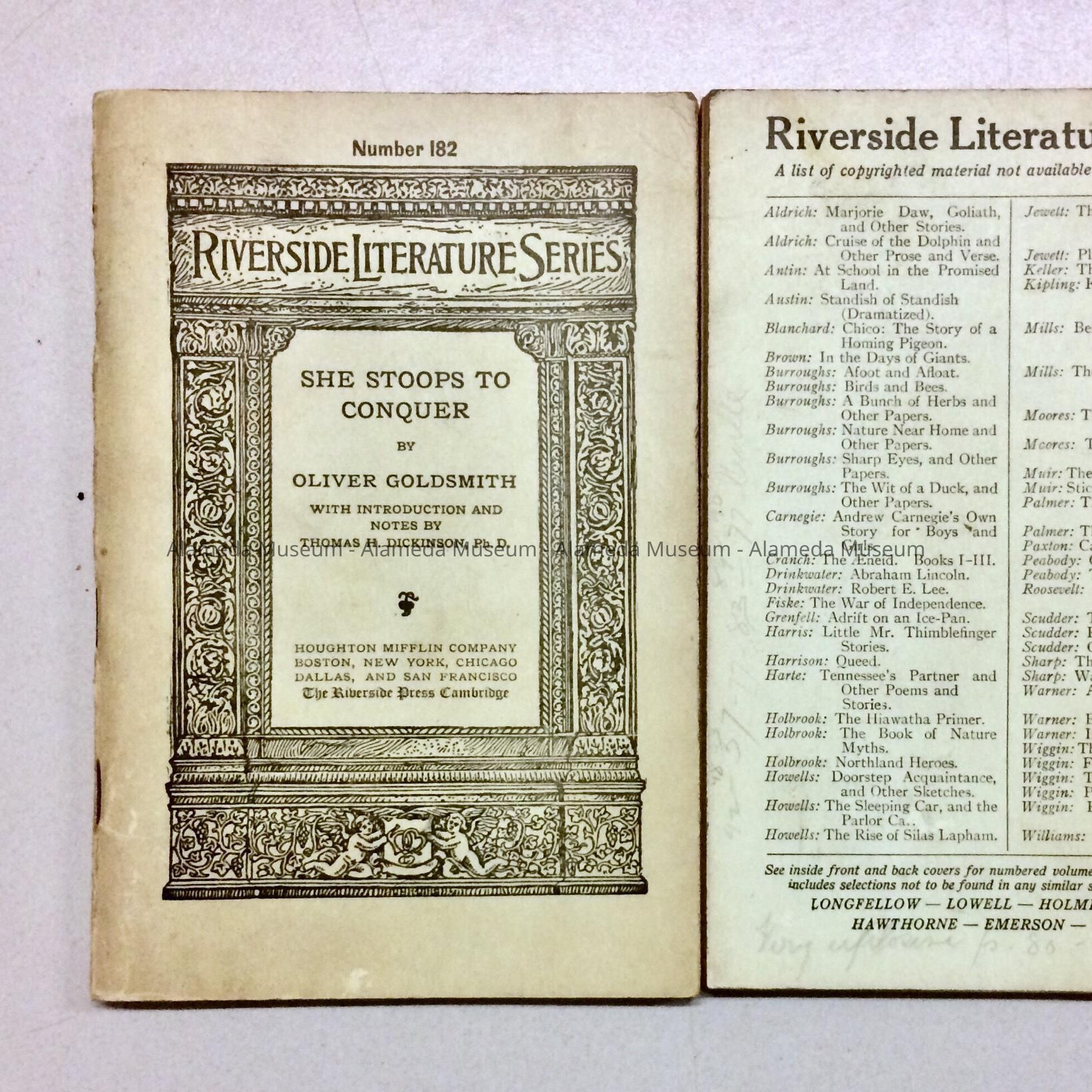 DESCRIPTION: SOFT COVERED BOOKLETS WITH BOLD PRINTED CAPTIONS, "RIVERSIDE LITERATURE SERIES, SHE STOOPS TO CONQUER," WITH BLACK COLORED TYPE ON PALE GREEN COLORED BACKGROUNDS.