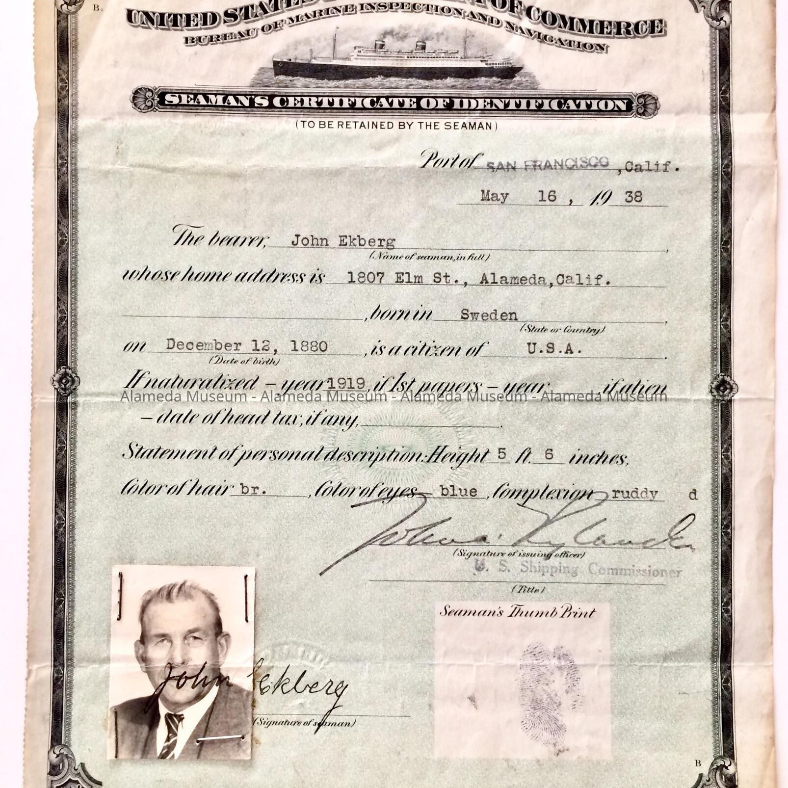 SEAMAN'S CERTIFICATE OF IDENTIFICATION, DATED MAY 16, 1938, FOR JOHN EKBERG, RESIDENT OF 1807 ELM STREET, ALAMEDA, CALIFORNIA.