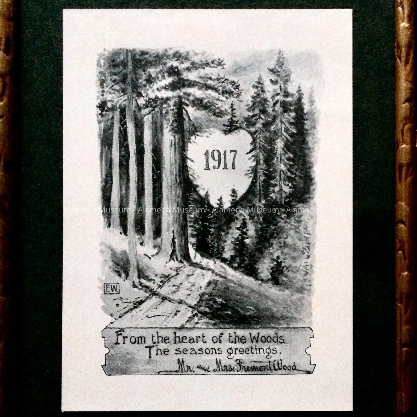 History of Object: A framed “Season's Greetings from the Woods” print, the work of Alameda resident Fremont Wood. (See card 19.60.1 for more details.)