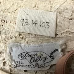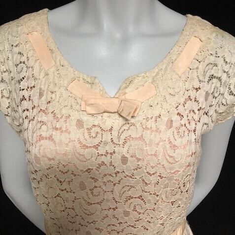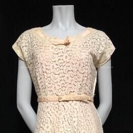 Description: Short sleeve, calf length off white colored machine made lace dress with pink taffeta slip or liner. Fabric repeated on belt and bow at neckline. Original label "Ann Colby".